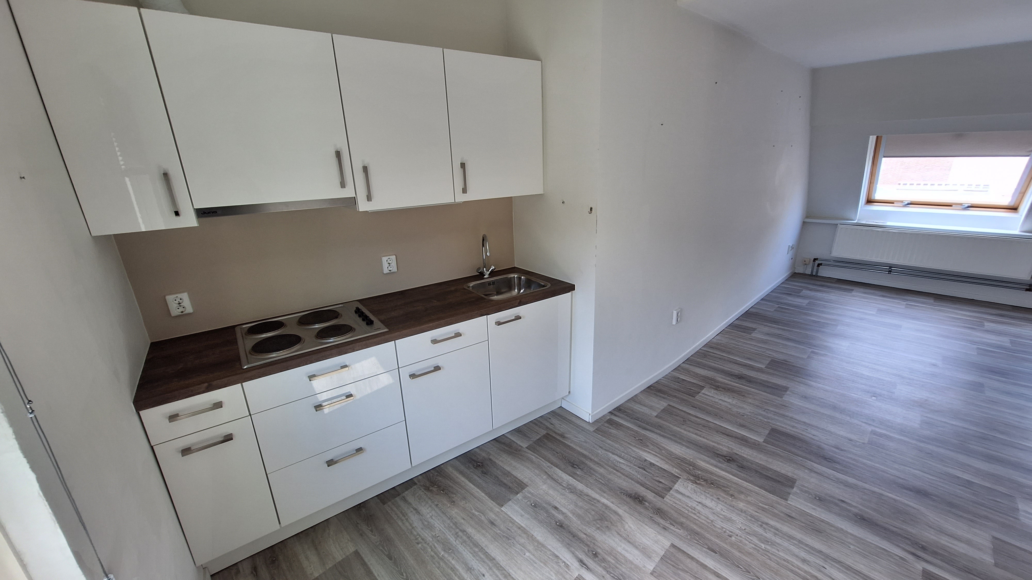 De half open keuken is voorzien elektrische kookplaat en afzuigkap. Een koelkast plaatst u zelf.