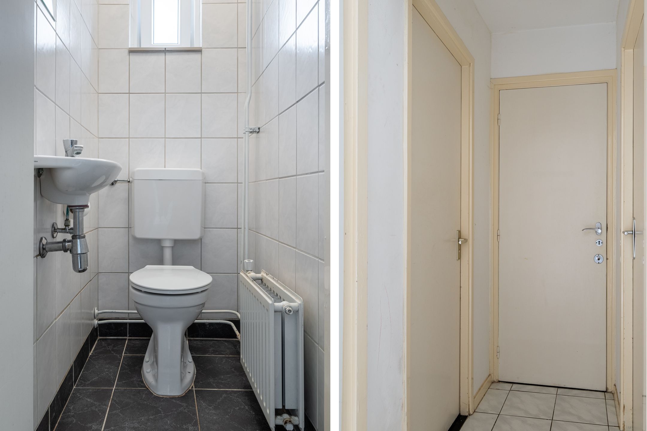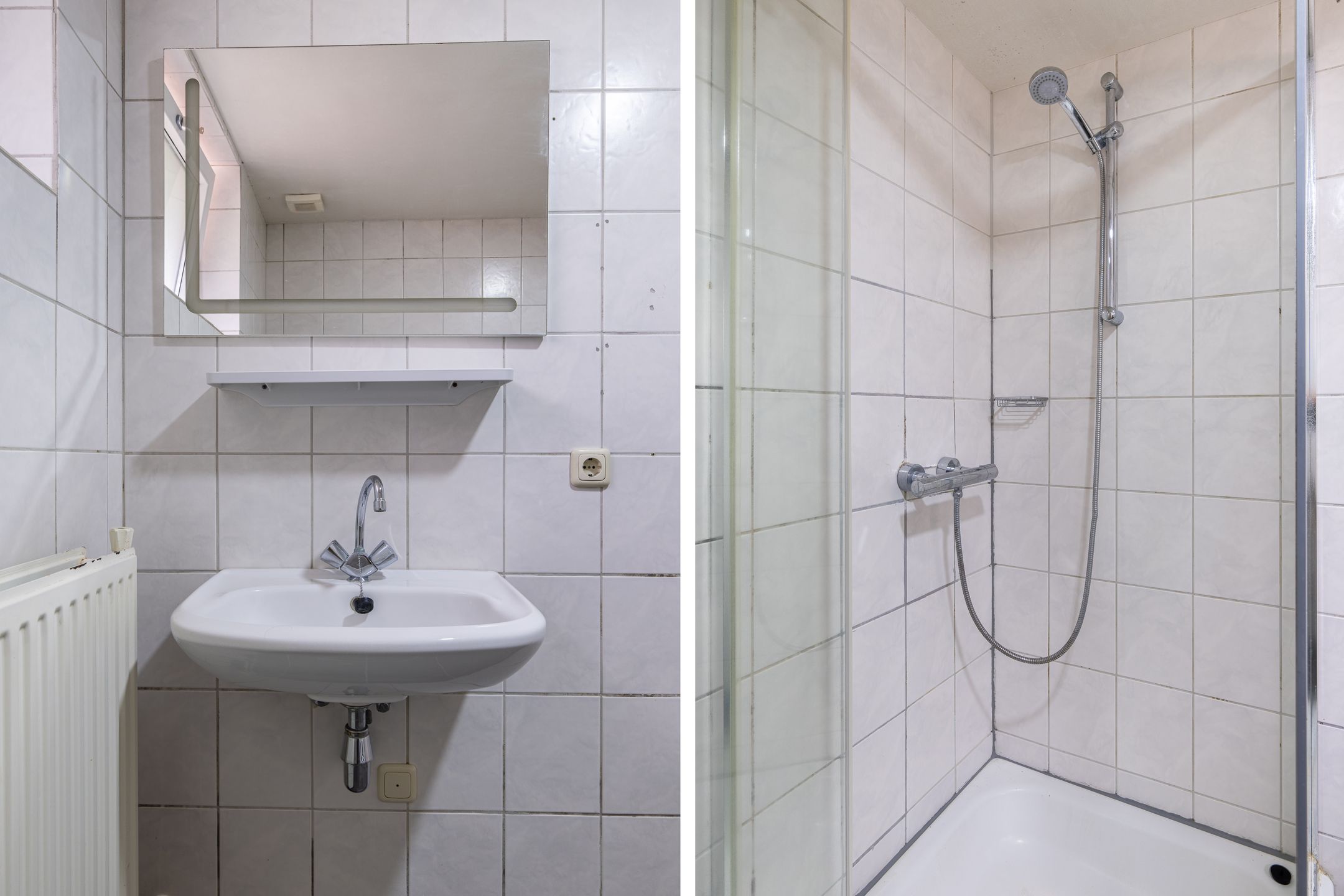 Er is geheel betegelde toiletruimte met staand toilet en fonteintje. Daarnaast ligt de geheel betegelde badkamer met douchecabine, vaste wastafel en aansluitpunt voor wasapparatuur. Tevens ligt hier ook een slaapkamer 3.49 x 2.52.