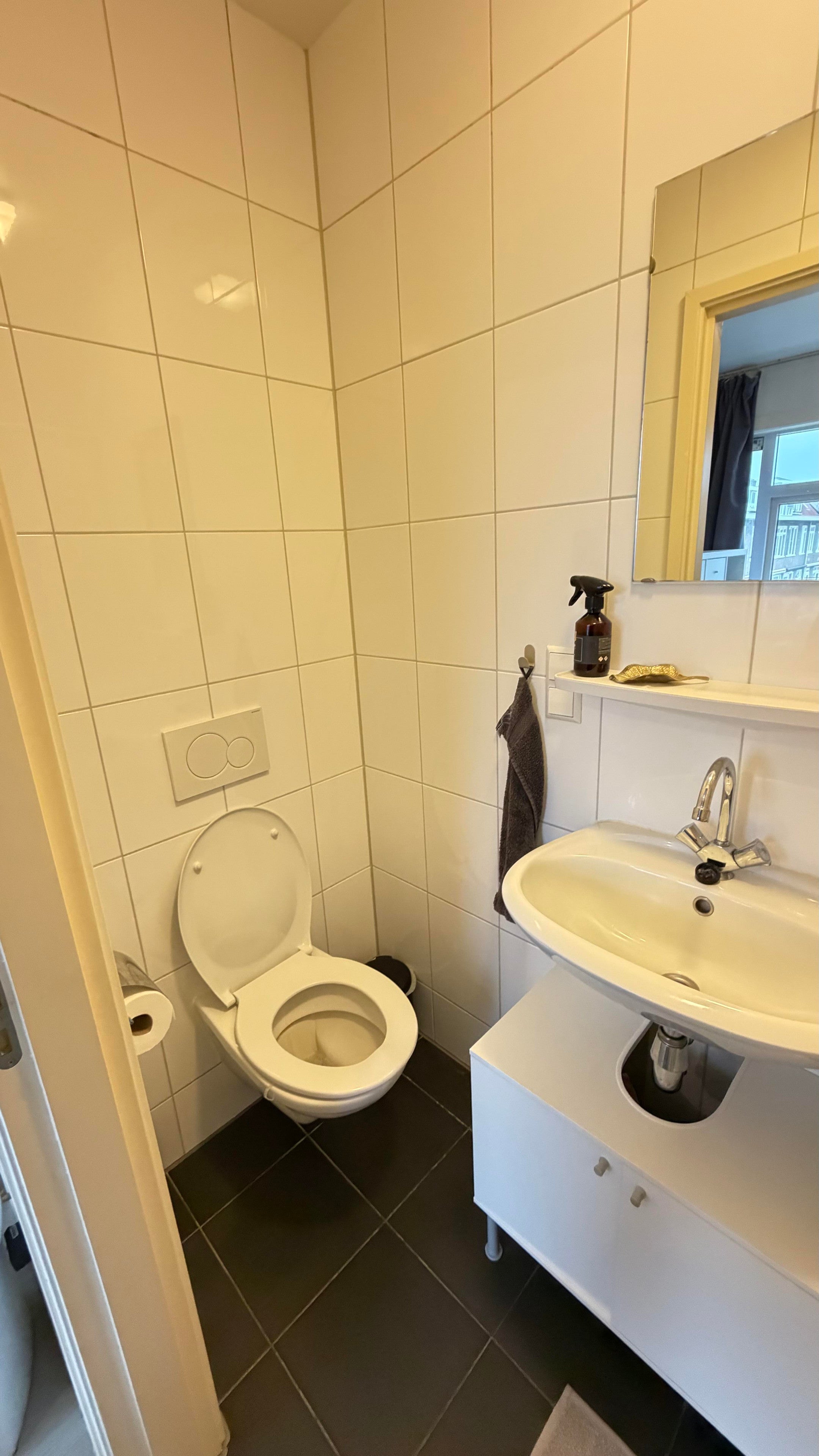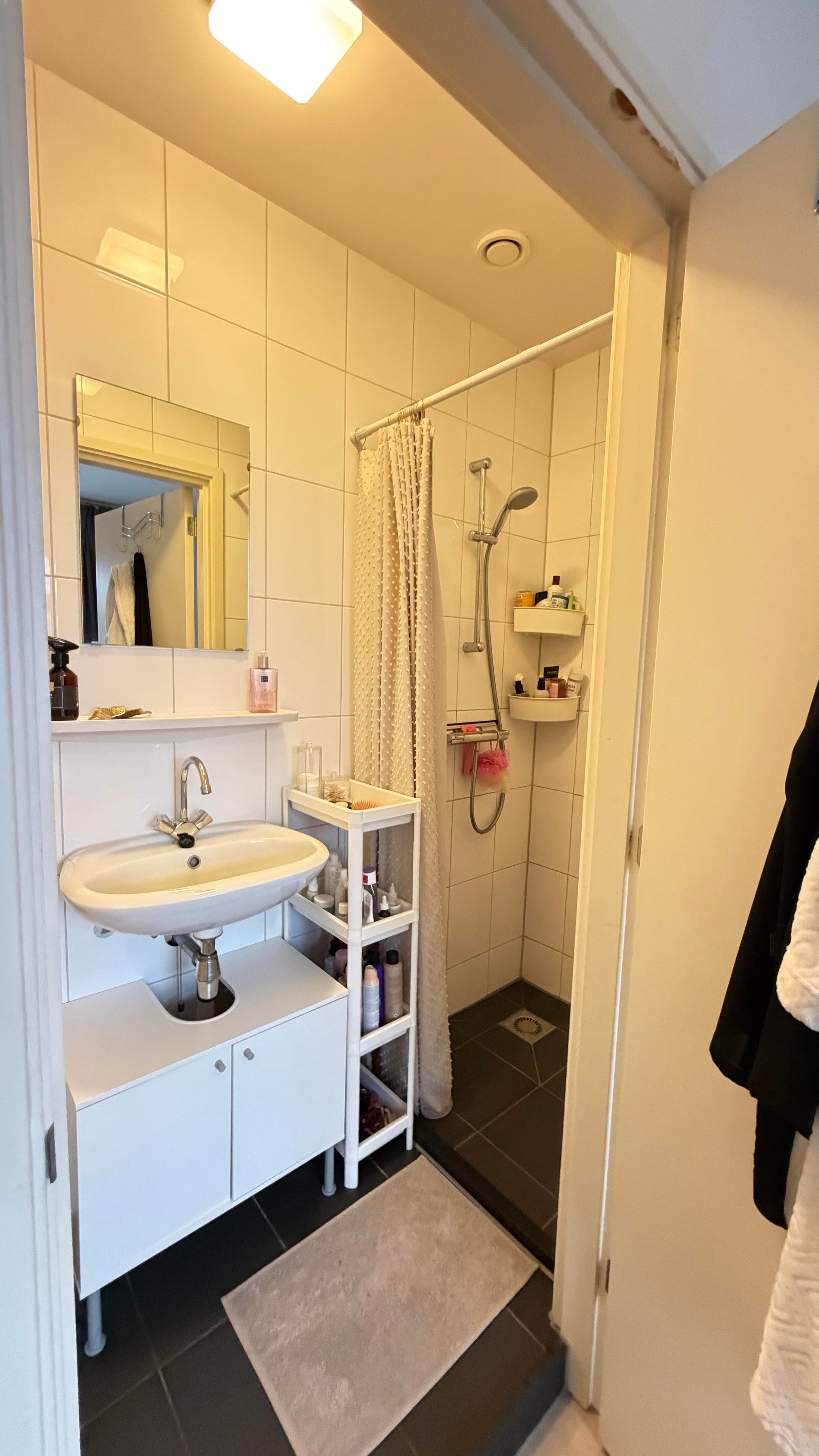 De badkamer is volledig betegeld en netjes afgewerkt met een douche, wastafel en toilet.