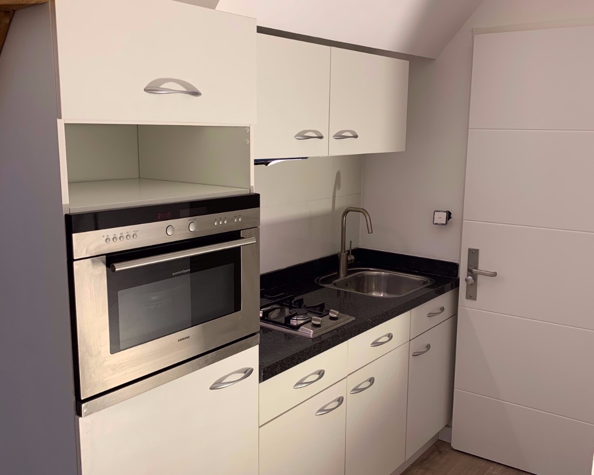 De keuken is gelegen in de studio en heeft een afzuigkap, 4-pits kookstel en een nieuw magnetron.
