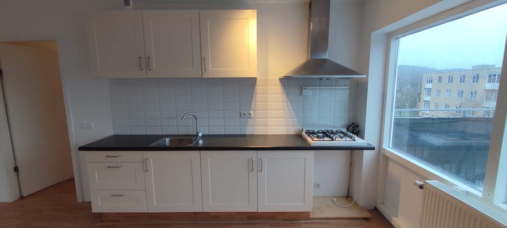 Het nette appartement bevindt zich op de tweede verdieping en beschikt over een lichte woonkamer met open keuken (ca. 30 m²) dankzij de royale raampartijen. De keuken is uitgerust met een kookplaat en afzuigkap.