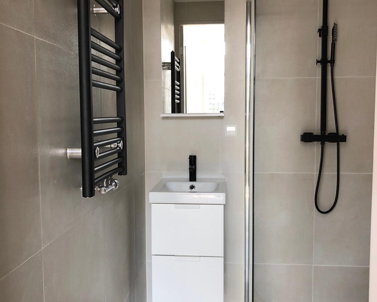 Gedeeld Badkamer met 1 dame, zweeftoilet en douche, wastafel spiegel.