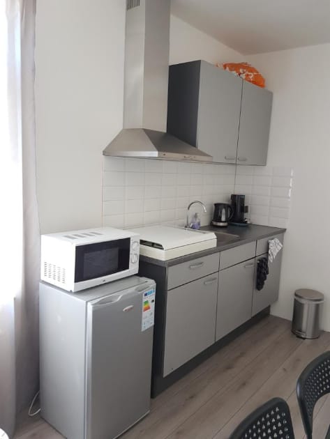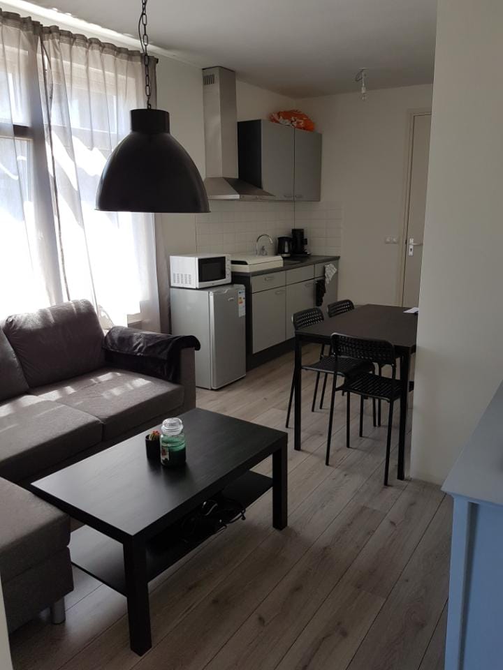 Het is een studio van +/-25 m2 met eigen woonkamer, slaapkamer, douche, toilet, keuken en eigen ingang. Er is gemeenschappelijk wasmachine, stofzuiger en een balkon aanwezig. De studio is relatief nieuw (8 jaar geleden aangebouwd).