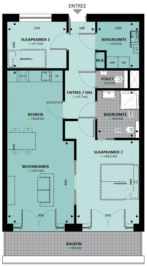 Dit appartement bevindt zich op de zuidwestkant van de eerste verdieping (entree B).