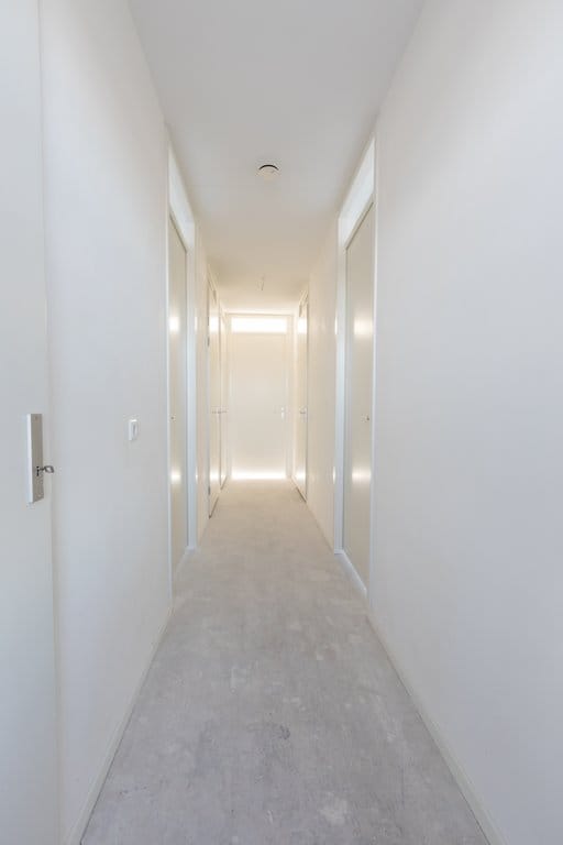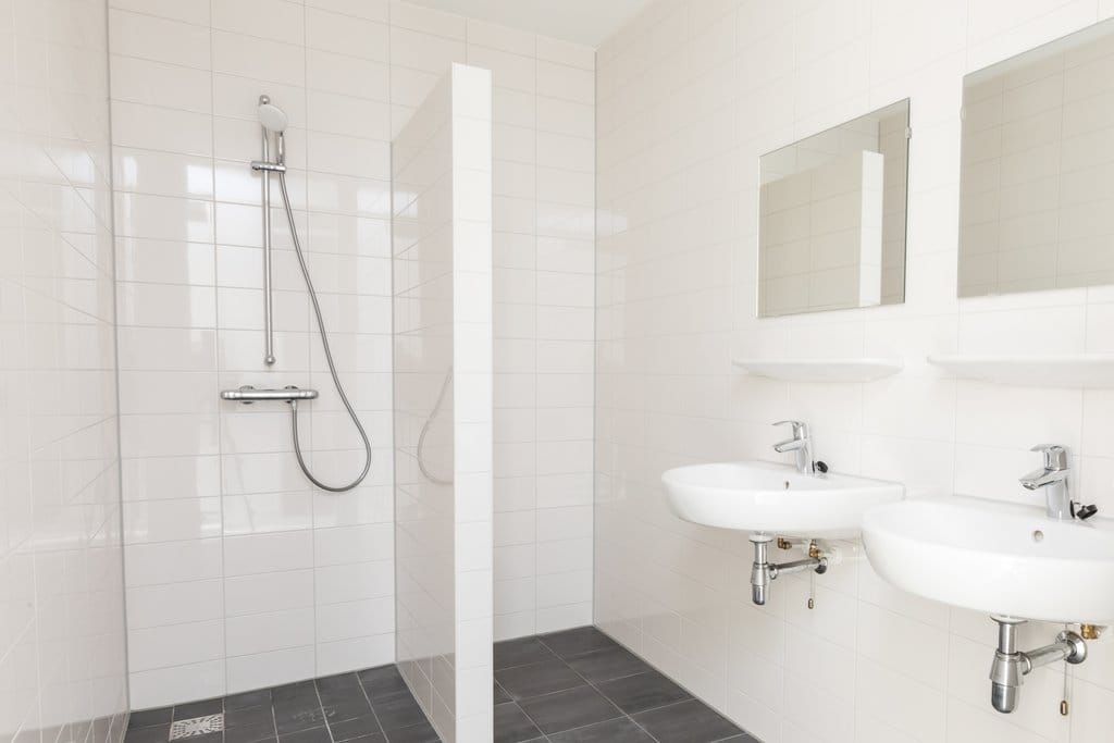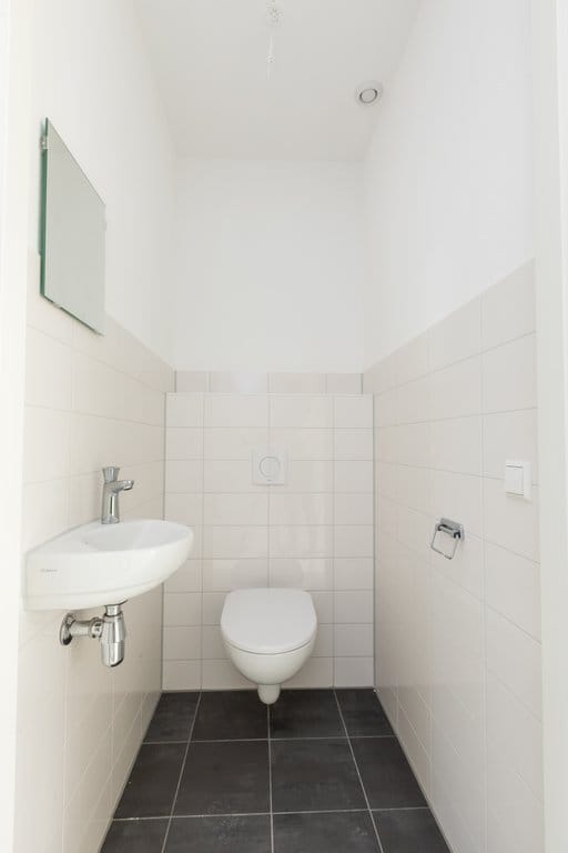 De luxe badkamer is uitgerust met een douchehoek, dubbele wastafel en is betegeld tot het plafond. Daarbij heeft het appartement een separaat toilet met fonteintje in de entreehal.