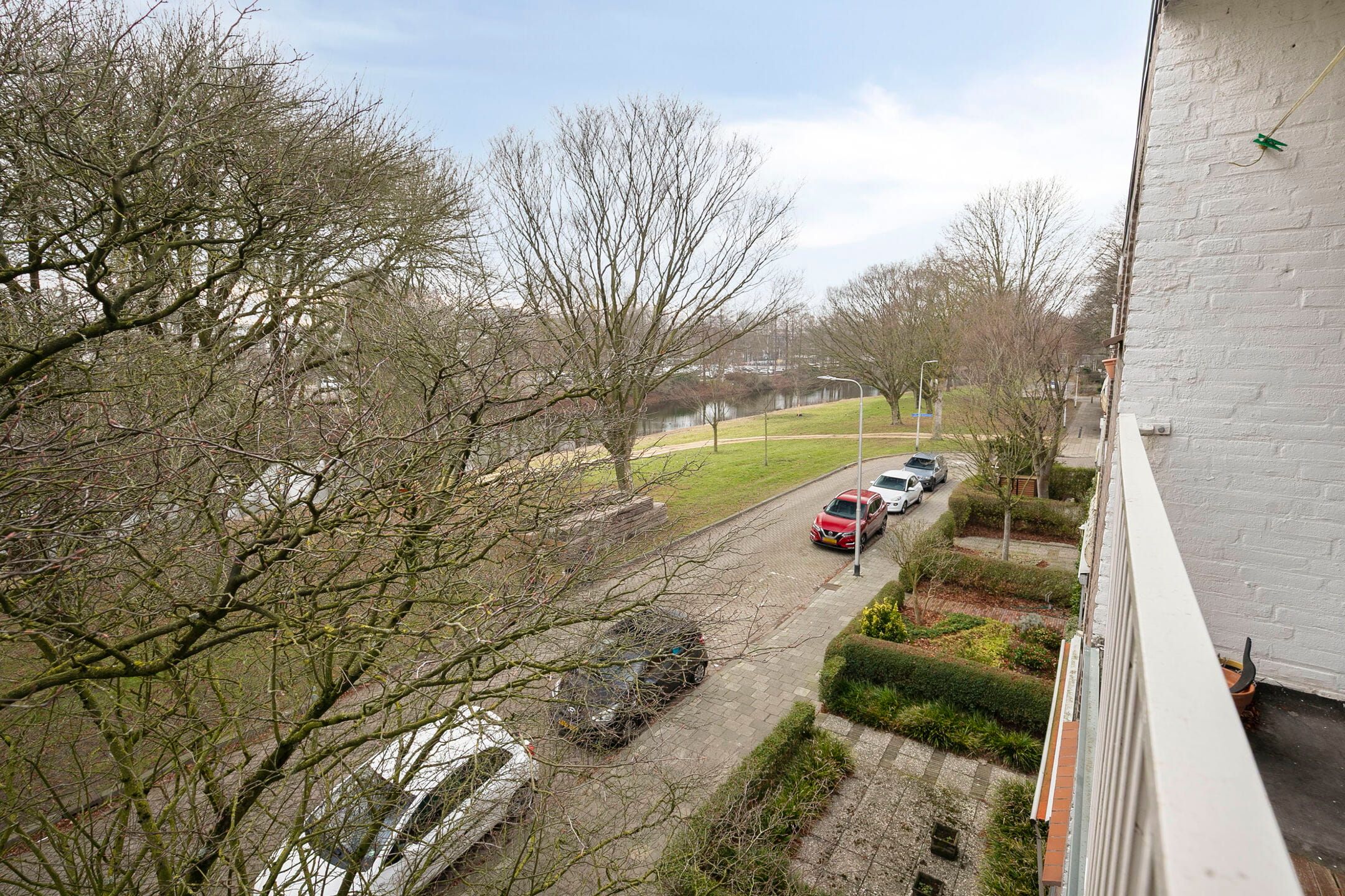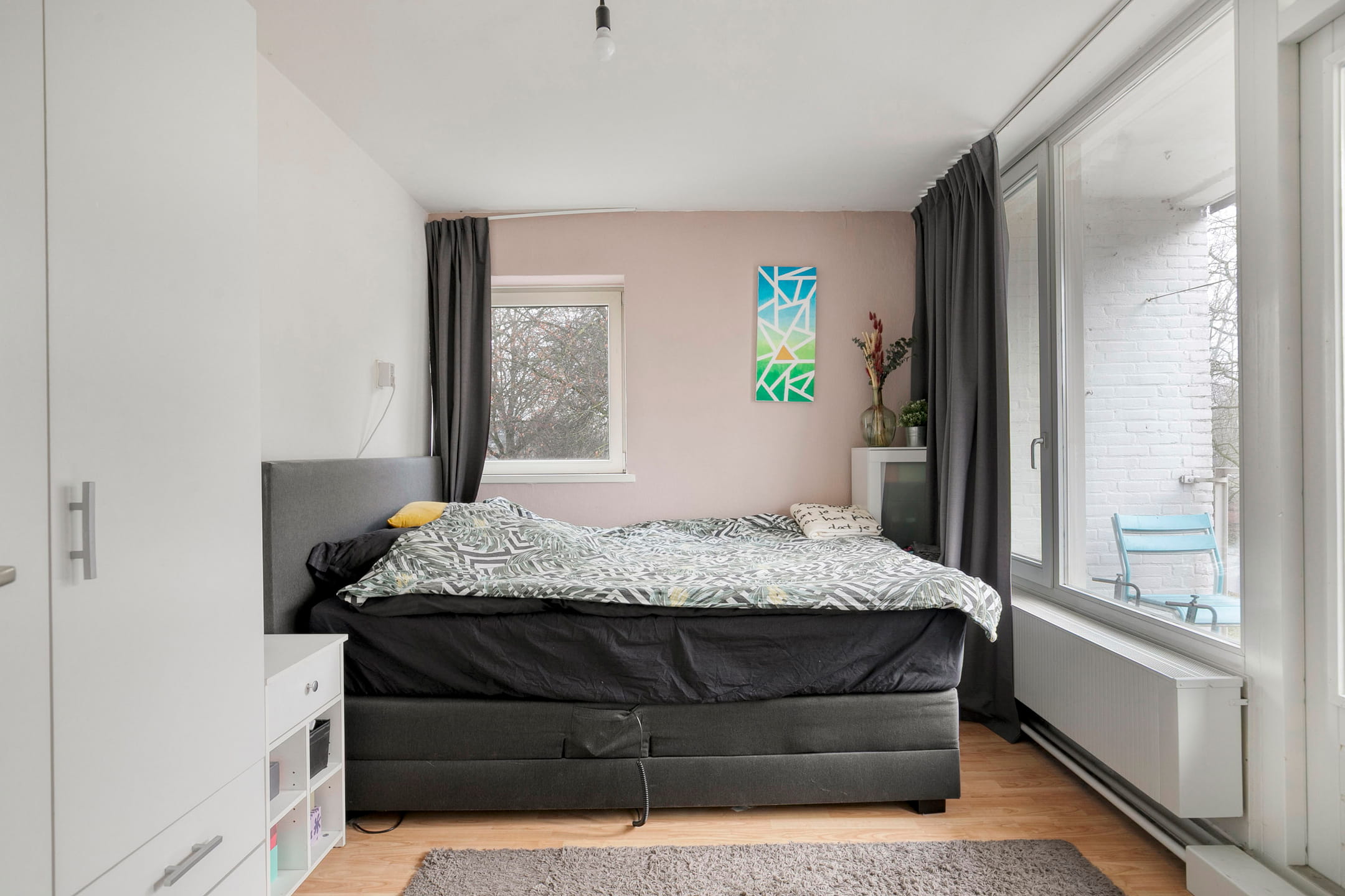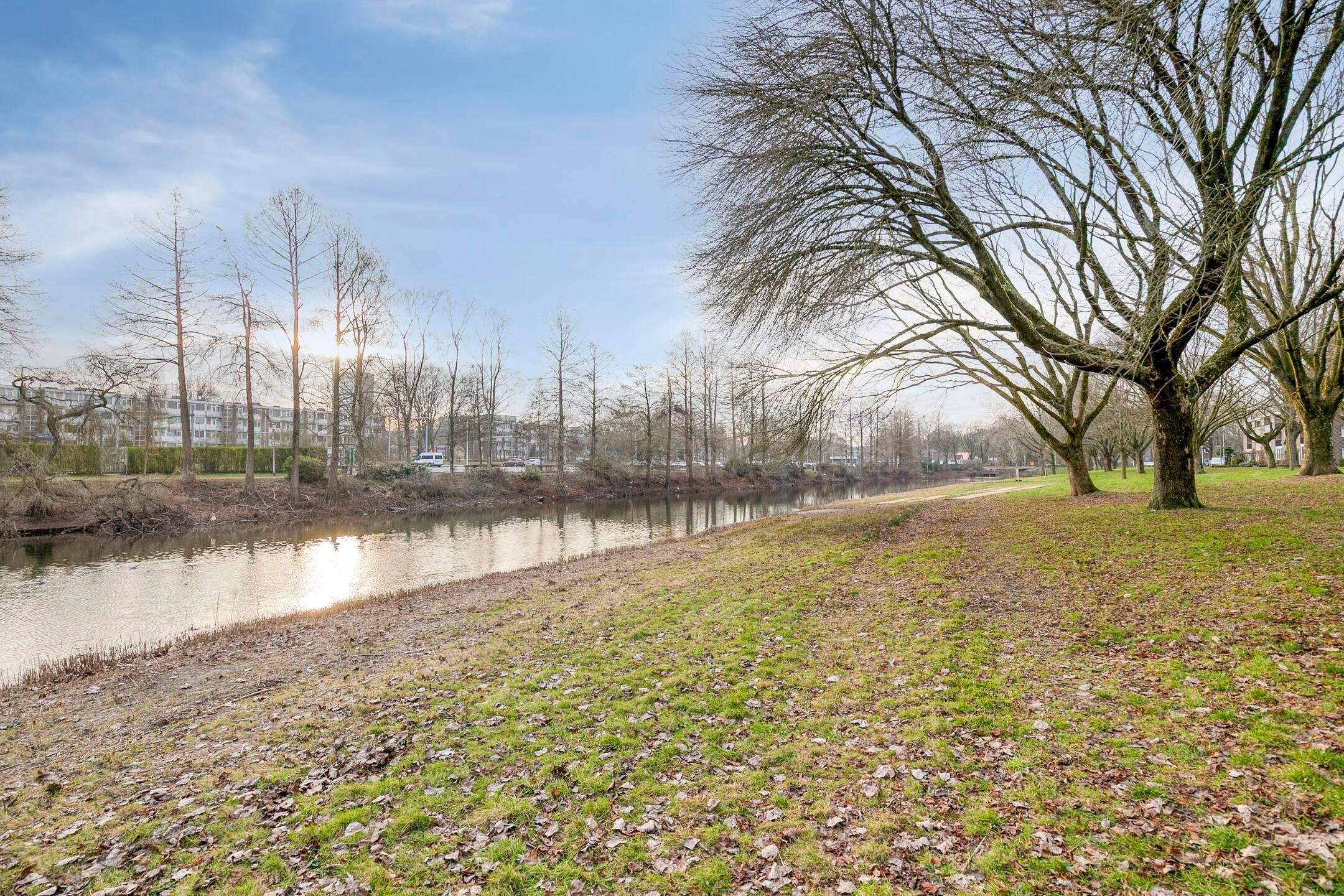 De slaapkamer bevindt zich aan de voorzijde van de woning en heeft toegang tot een balkon met uitzicht op het kanaal. De badkamer is compact en functioneel ingericht.