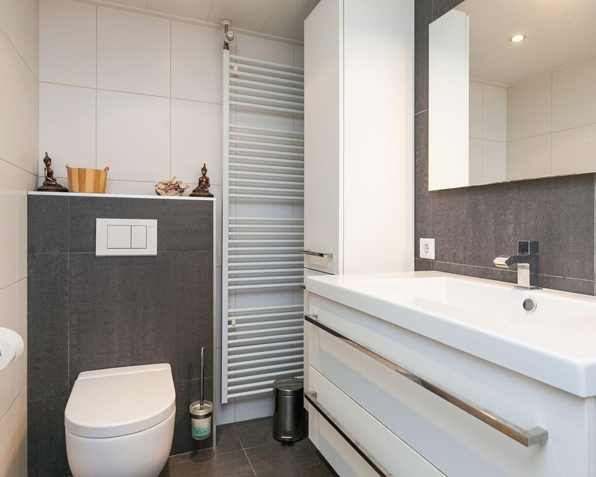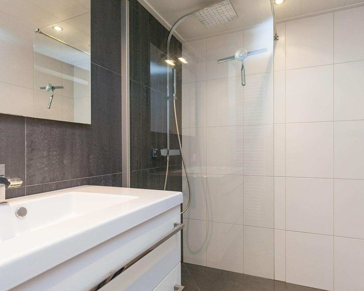 In de badkamer hebben wij een regendouche, een ruime wastafel en toilet. Beneden hebben we nog een ruimte voor fiets/scooter. Hier staan ook de wasmachine en droger. Tot slot hebben we een oprit waar je een eventuele auto zou kunnen plaatsen en een besloten achtertuin.