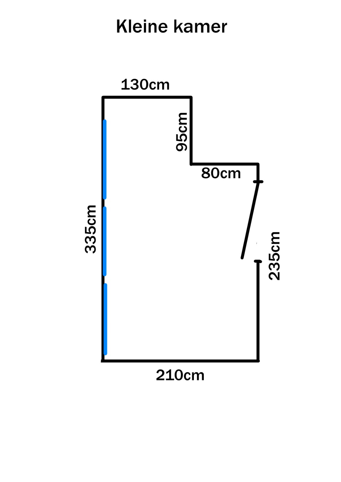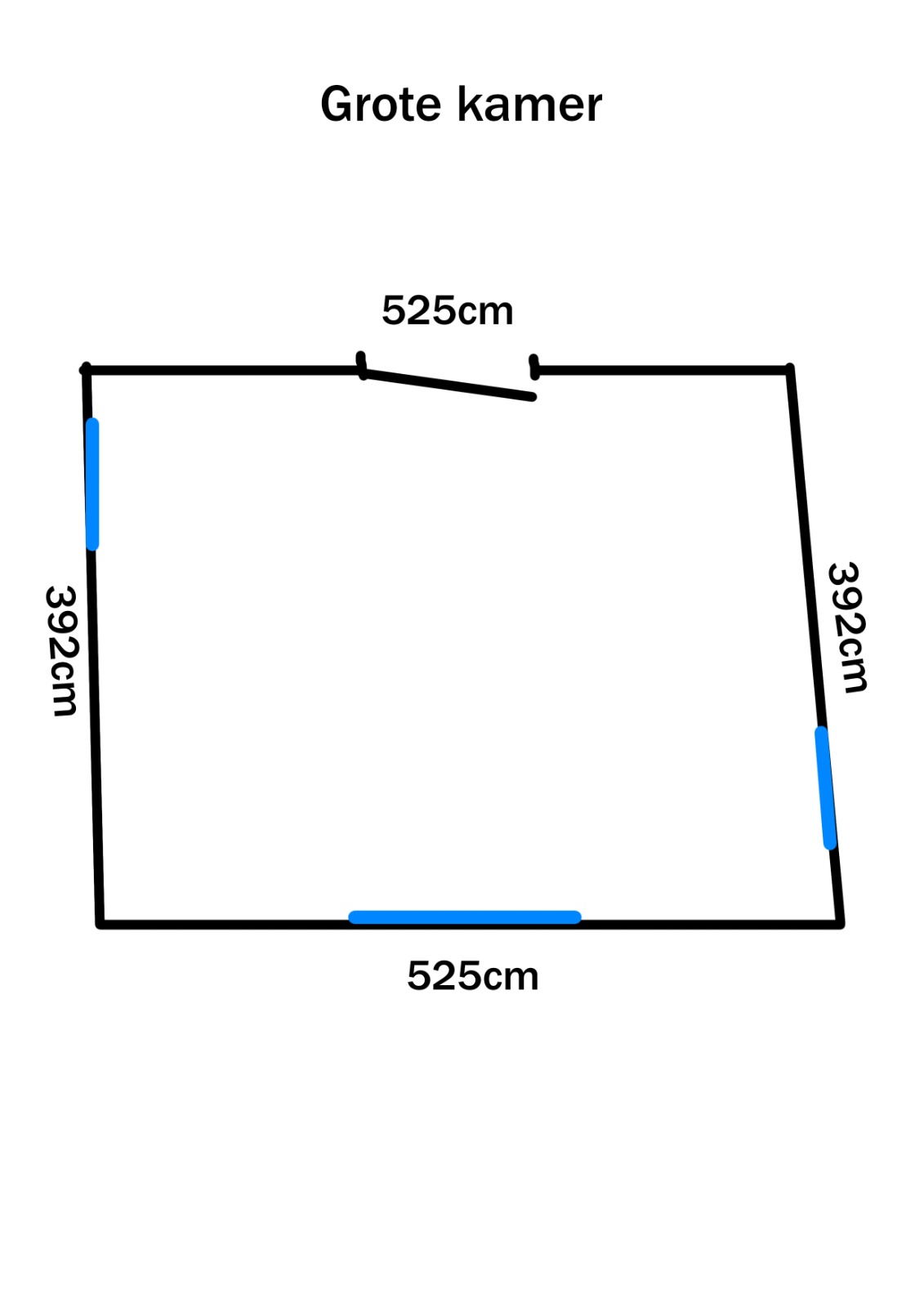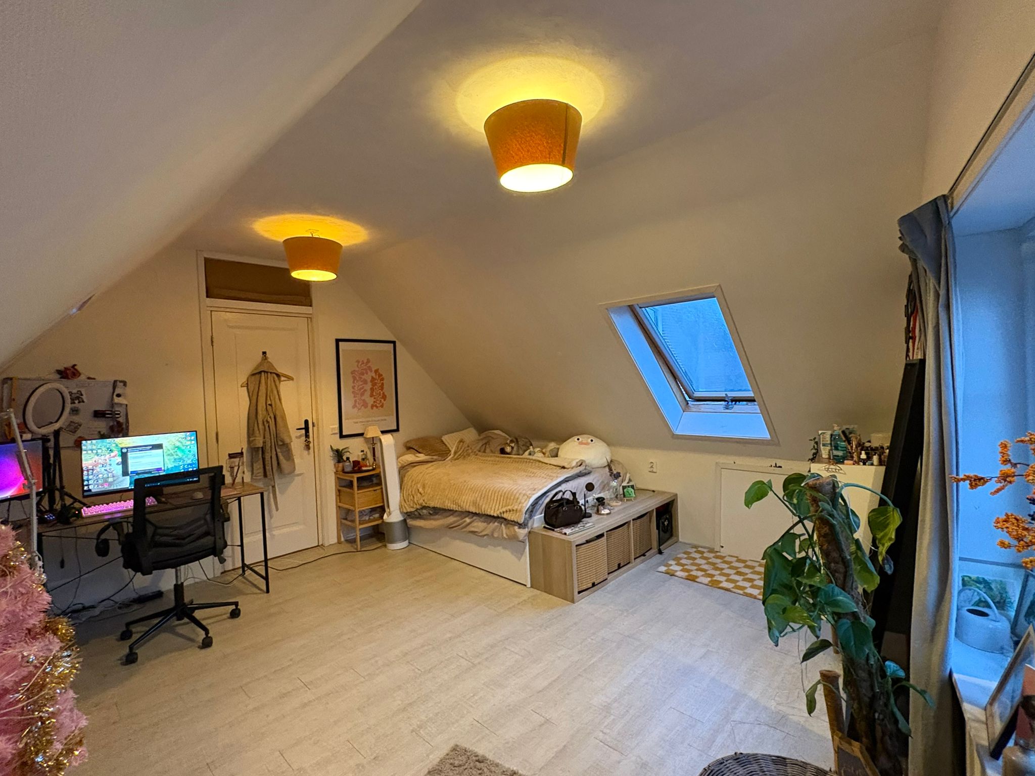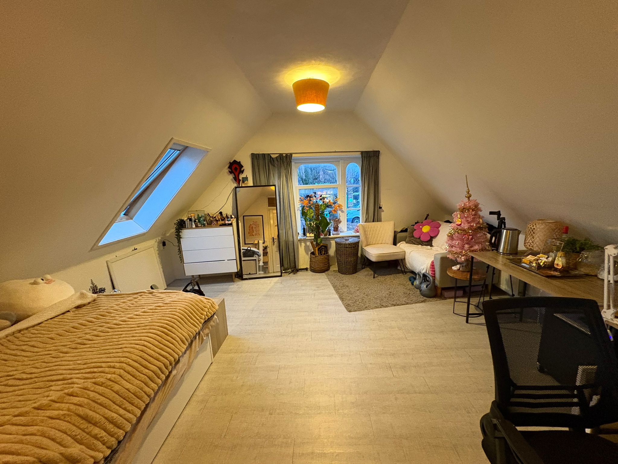 De kamer bestaat uit 2 naast elkaar gelegen kamers: 1 kamer van ruim 6 m2 met rechte wanden en 1 kamer van ruim 20 m2 met schuine wanden.
