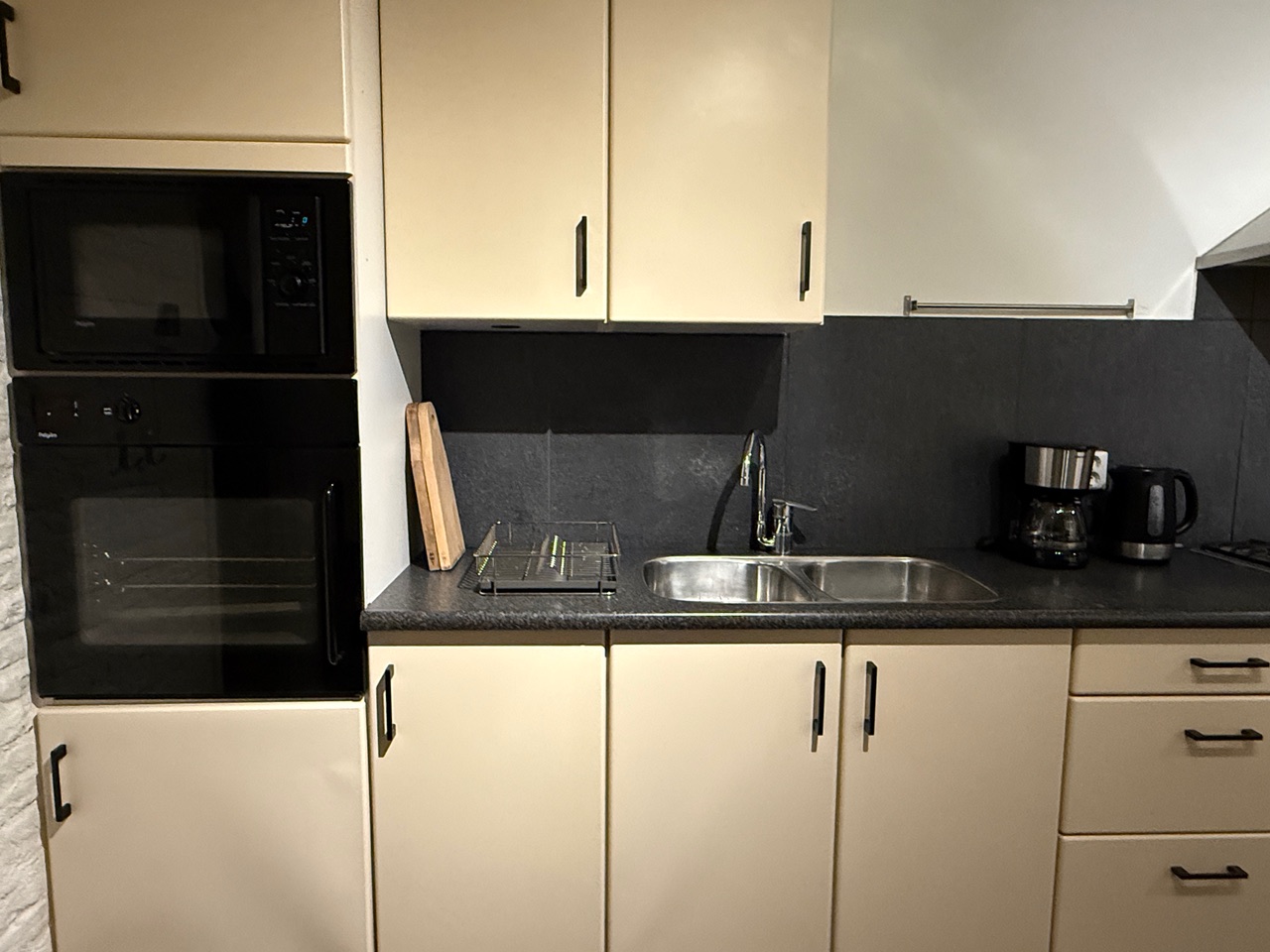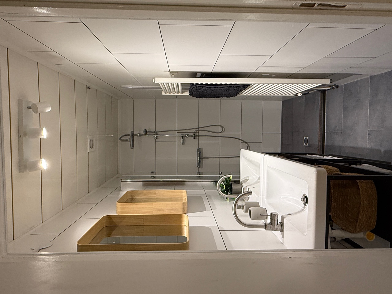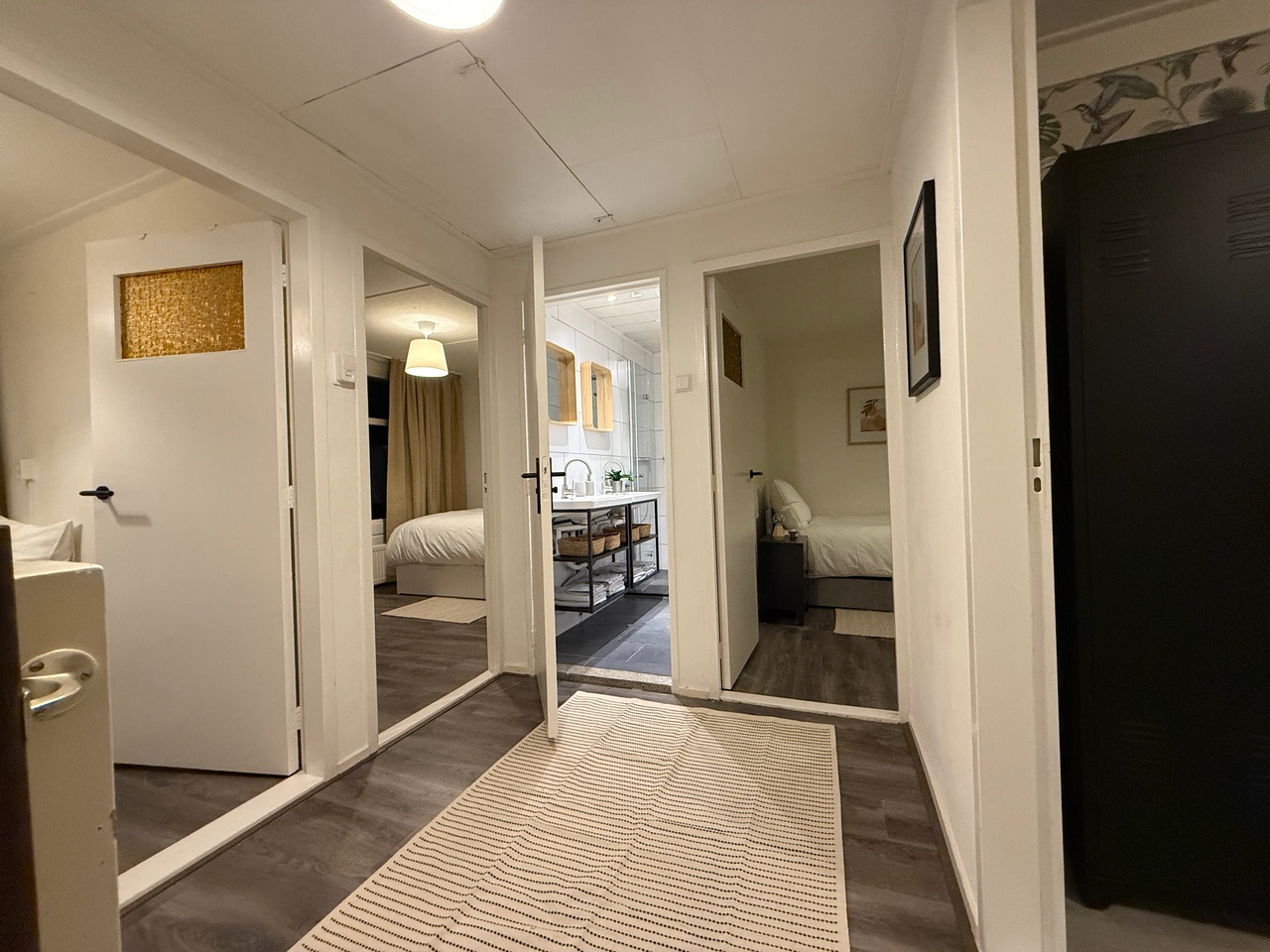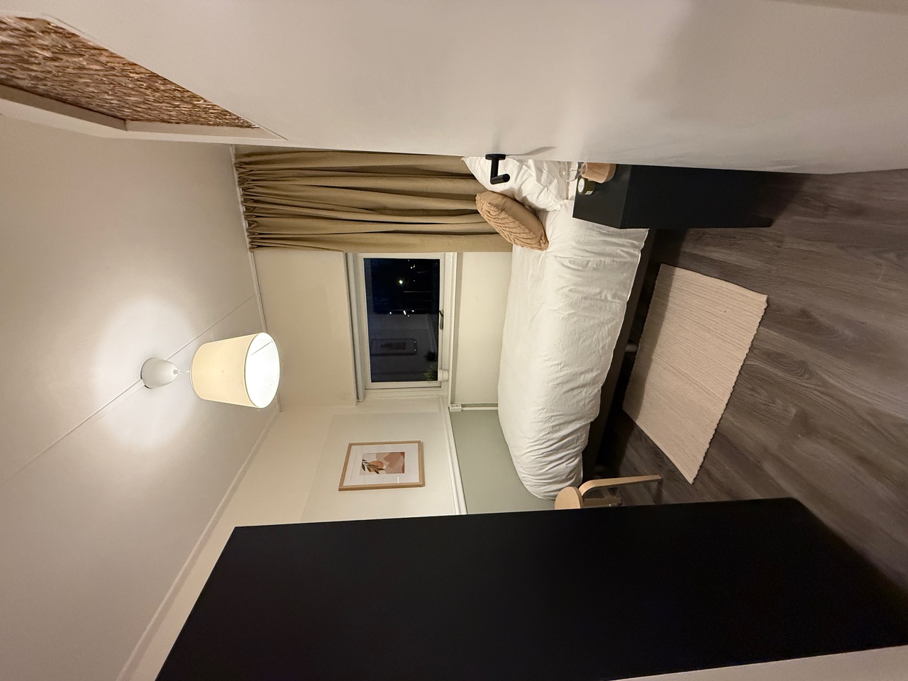 De kamer is ingericht met een eenpersoonsbed (90 cm breed) met wit bedlinnen, praktische kastruimte (zes planken en een kledingrek) en een nachtkastje. Afgewerkt met zandkleurige verduisterende gordijnen, een hanglamp, leeslampje, kruk, stoel, vloerkleed, wanddecoratie en voldoende stop.