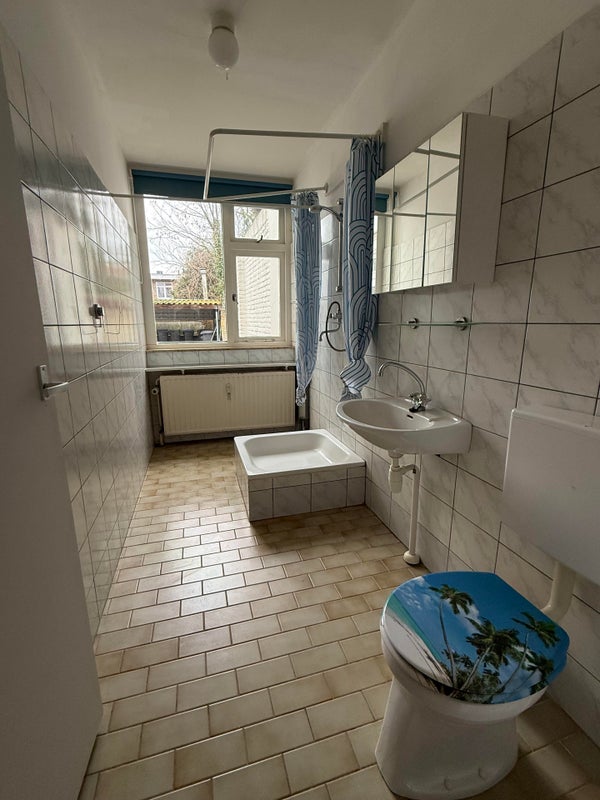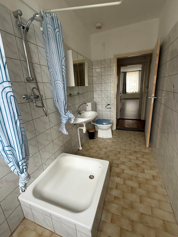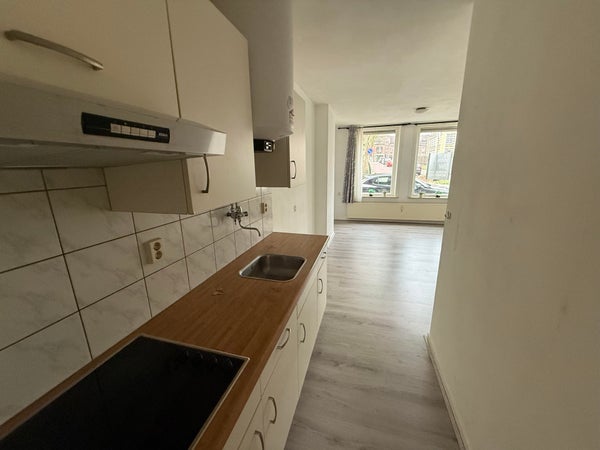 De woonkamer (ca. ) heeft een open keuken () voorzien van keukenblok met kookplaat. Aan de achterzijde is gelegen de badkamer (ca. ) met douche, wastafel, toilet en wasmachine aansluiting.Let op: de huurprijs is exclusief elektriciteit en €90,00 servicekosten per maand voor de stook kosten, water etc.