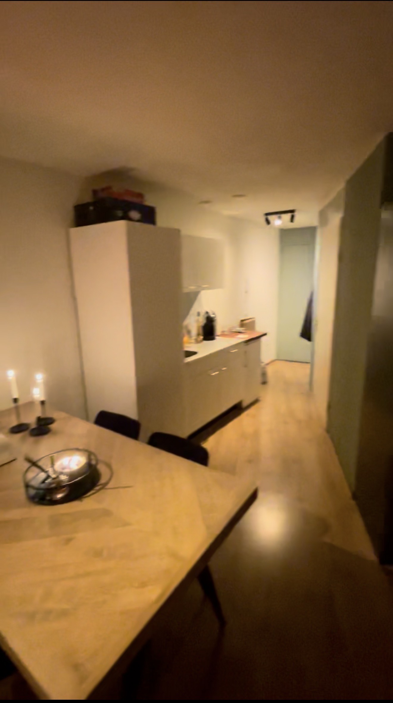 - Een grote gemeenschappelijke woonkamer met keuken(apparatuur), wasmachine en droger