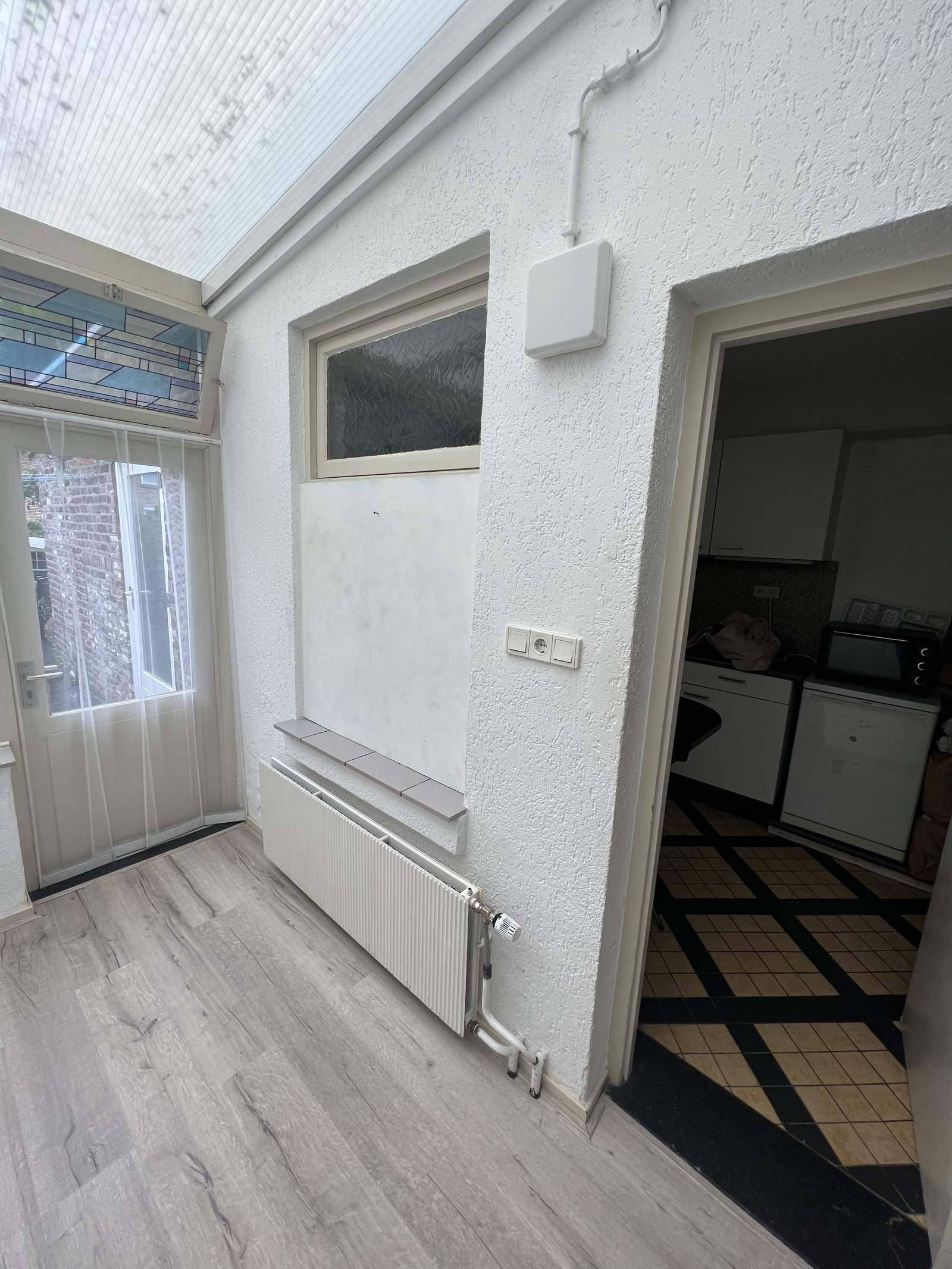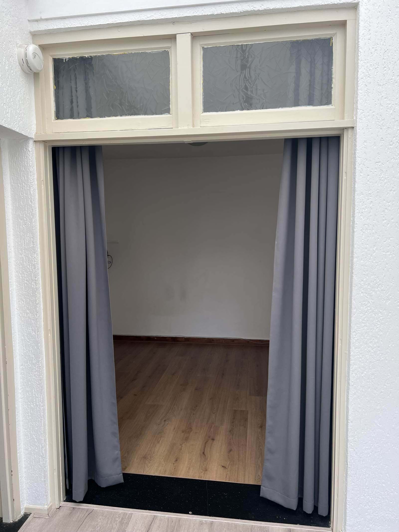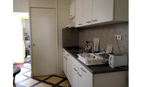 Lichte kamer met een apart slaapkamergedeelte en woongedeelte, op de begane grond van een gezellig klein studentenhuis, waarbij de huurder gebruik kan maken van de gemeenschappelijke keuken eveneens op de begane grond.