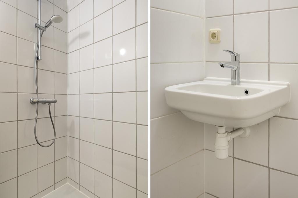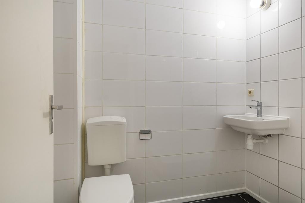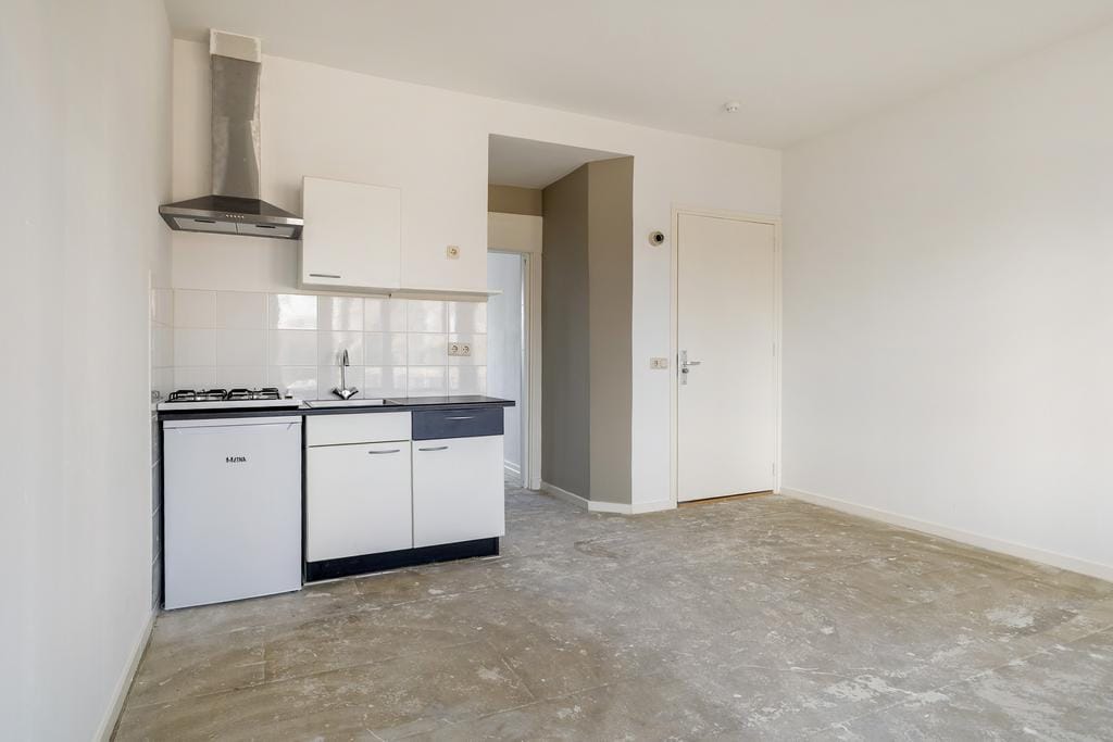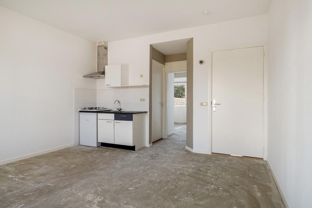 Directe binnenkomst in de woonkamer/keuken. De keuken bevat een gaskookplaat en afzuiging. De groten ramen zorgen voor veel lichtinval in de ruimte. In de aangrenzende nette badkamer bevindt zich een toilet, wastafel en doucheruimte.