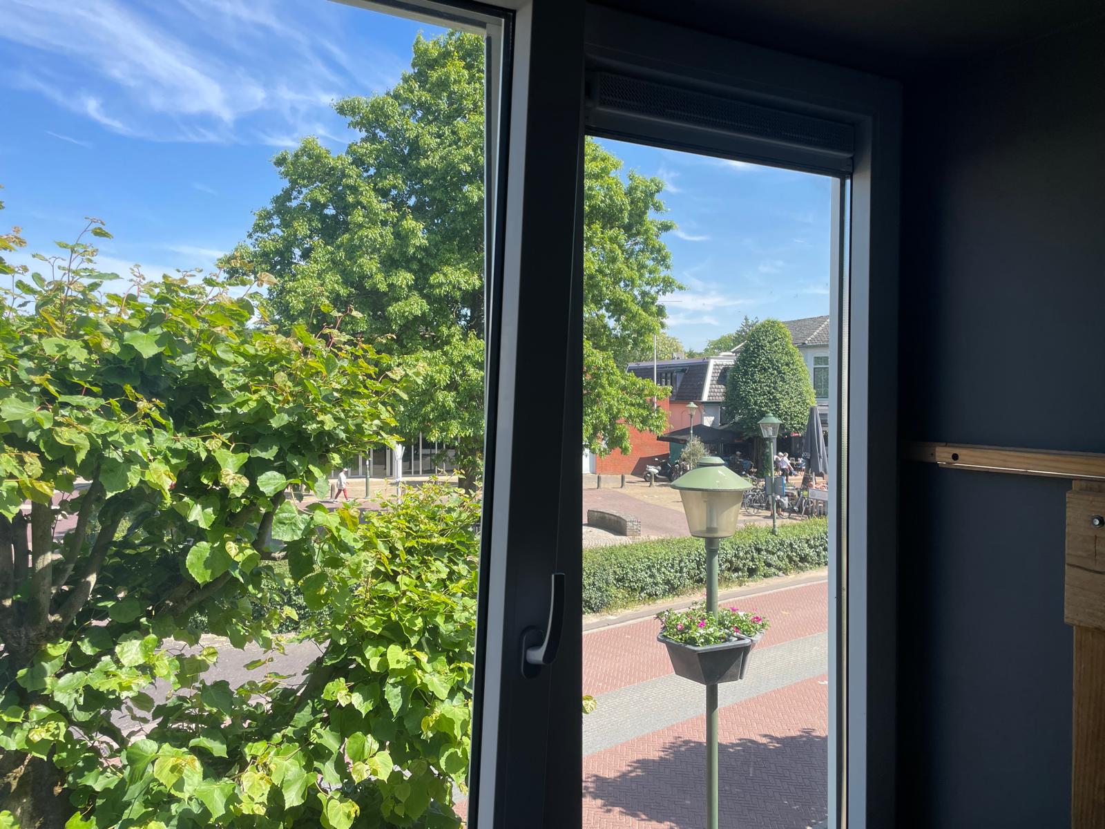De kamer is ongeveer 11 m2 gestoffeerd en kijkt uit op de Amersfoortse weg naar de terrassen en horeca.
