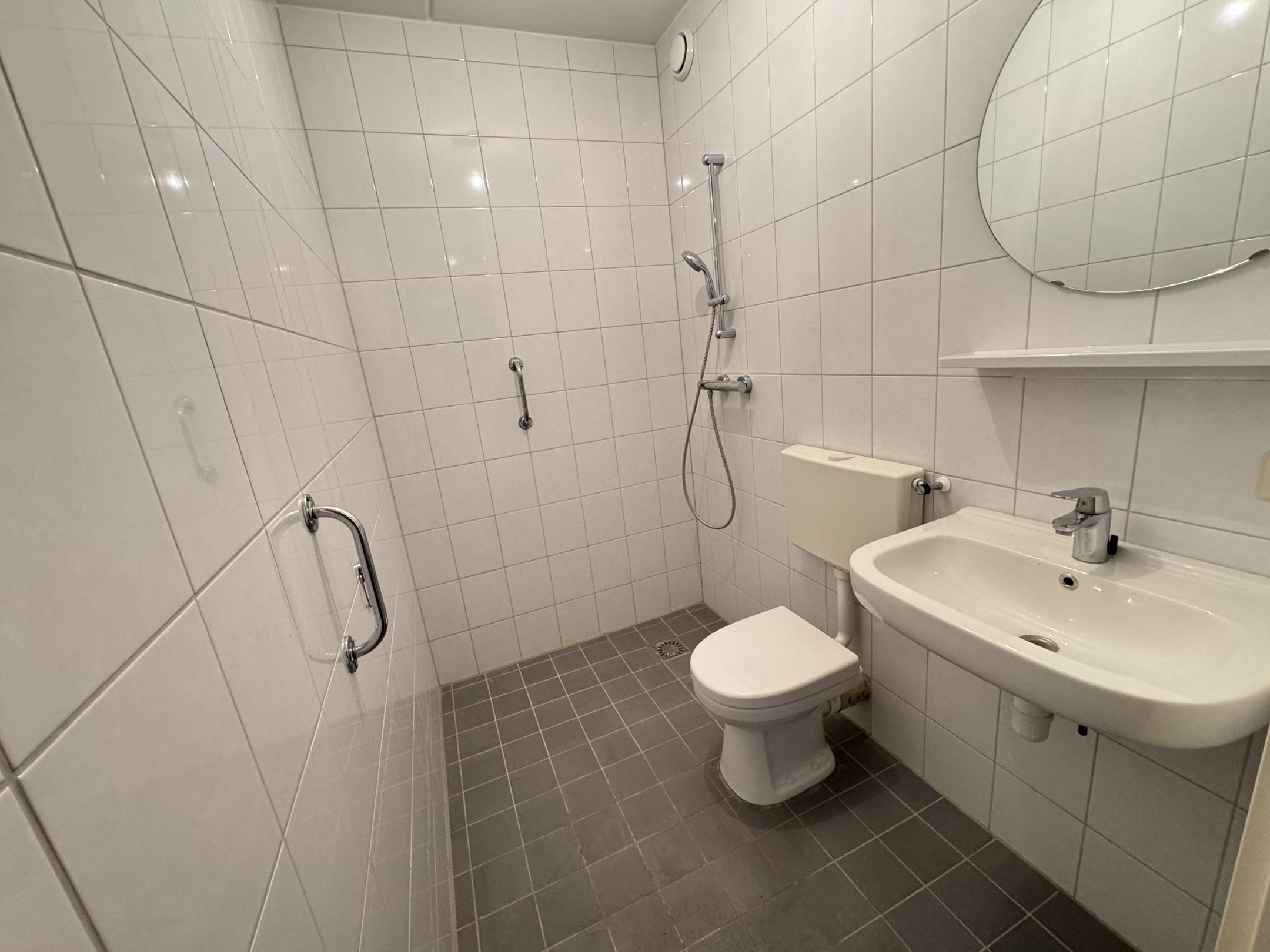 Het appartement is heerlijk licht en voelt meteen uitnodigend aan. U komt binnen in een ruime hal met meter- en bergruimte, gevolgd door een nette badkamer met douche, toilet en wastafel.