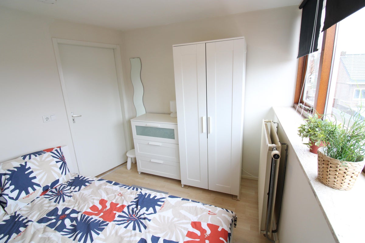 Aparte slaapkamer voorzien van een tweepersoonsbed en kledingkast. Volledig betegelde badkamer voorzien van een toilet, wastafel en douche.