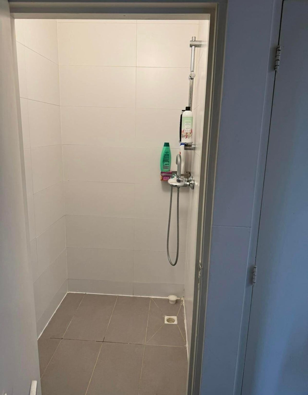 Gedeelde, volledig betegelde badkamer met inloopdouche