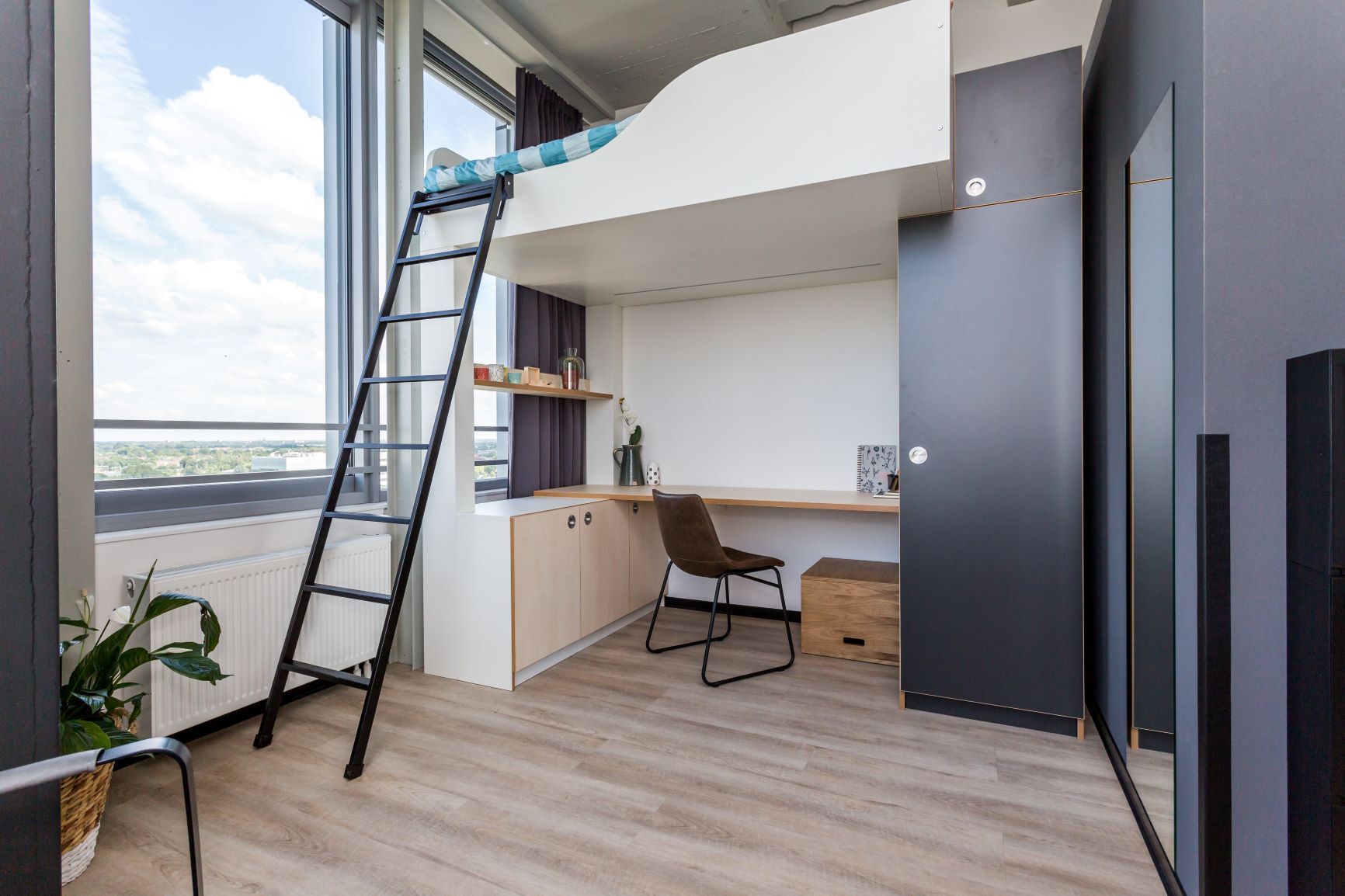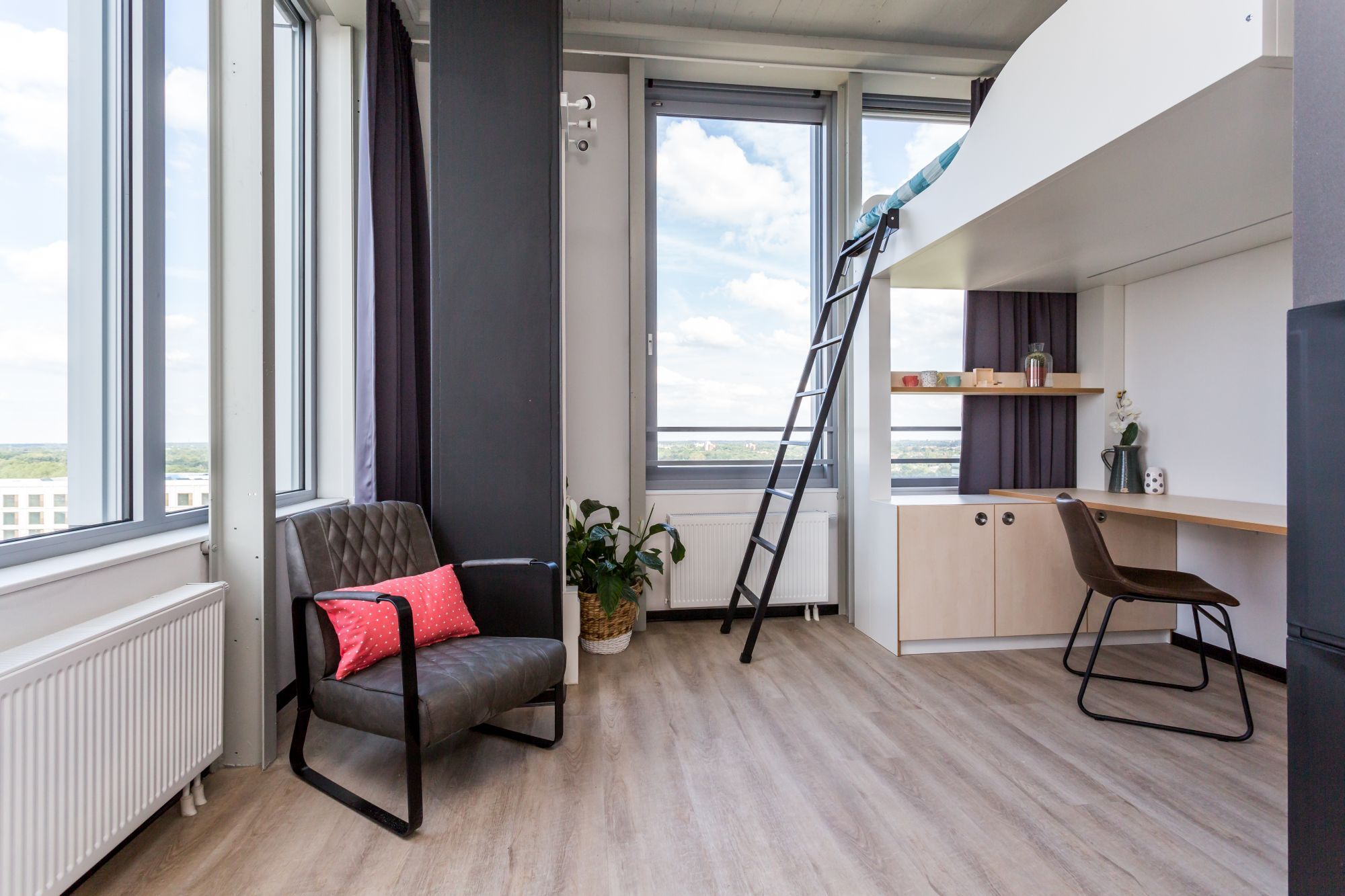 De Universiteit is helemaal om de hoek, het complex ligt op de campus zelf en vlak naast de Universiteit van Eindhoven! Deze appartementen hebben een contract voor onbepaalde tijd zolang je student bent. Deze studio heeft een eigen badkamer en keuken. De ruimte is gestoffeerd en gemeubileerd, zodat je er direct in kunt trekken. Het complex biedt je ook gezamenlijke ruimtes waar je huisgenoten kunt ontmoeten. Behalve de huur, komen ook de nuts- en servicekosten voor je rekening. Er een wasserrette in het pand aanwezig waar je tegen betaling met de Pay2Wash app gebruik kunt maken van de wasmachines en drogers.