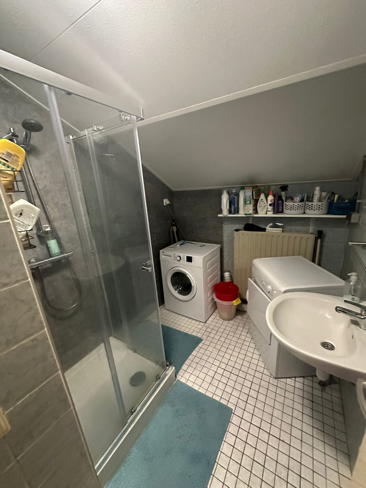 Wasmachine en droger aanwezig op de badkamer. Koelkast en vaste wastafel op de kamer..