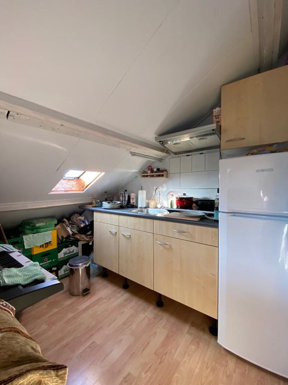 De zolderkamer heeft een oppervlakte van ongeveer 20m2 en heeft een eigen keuken.