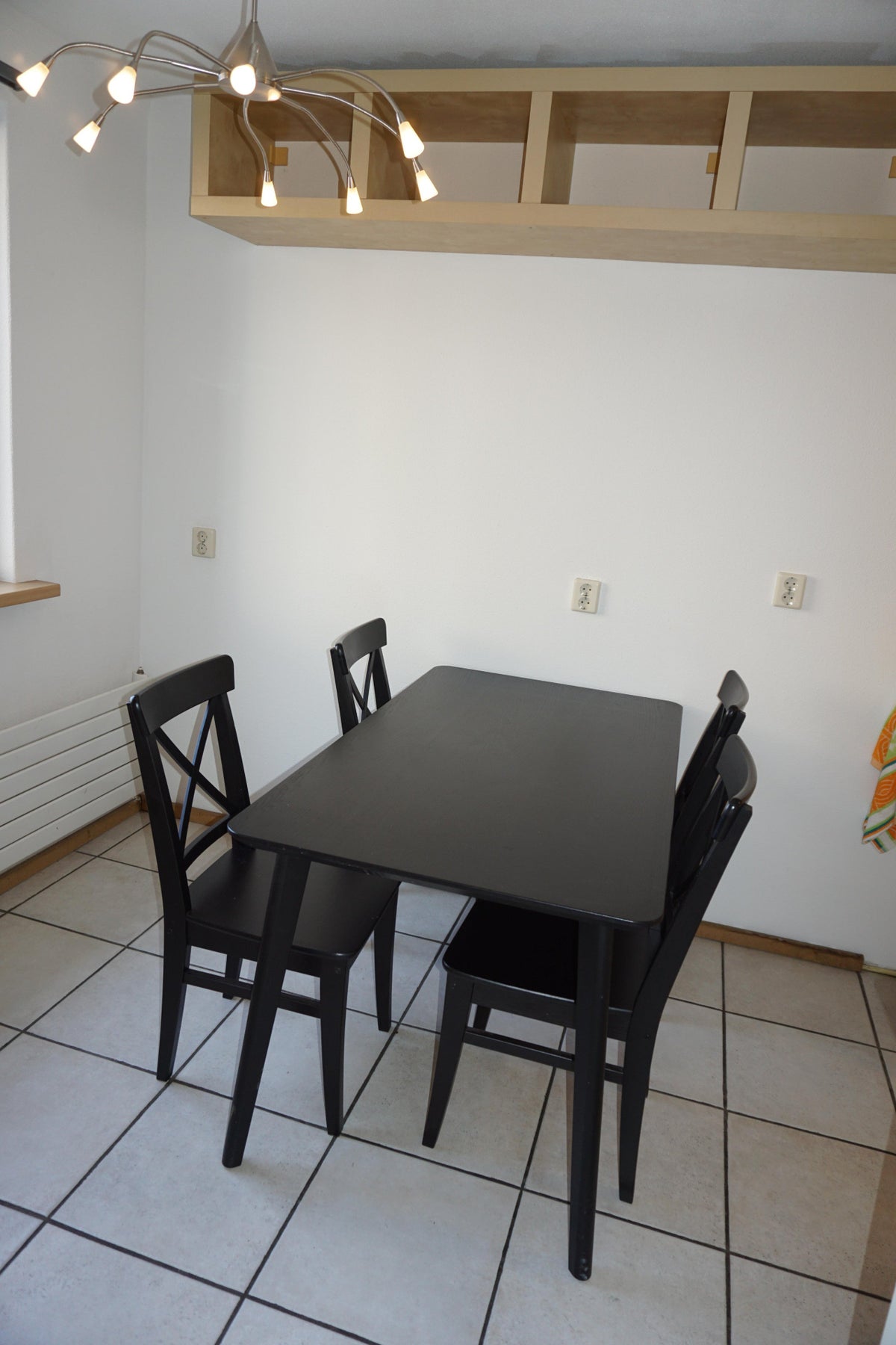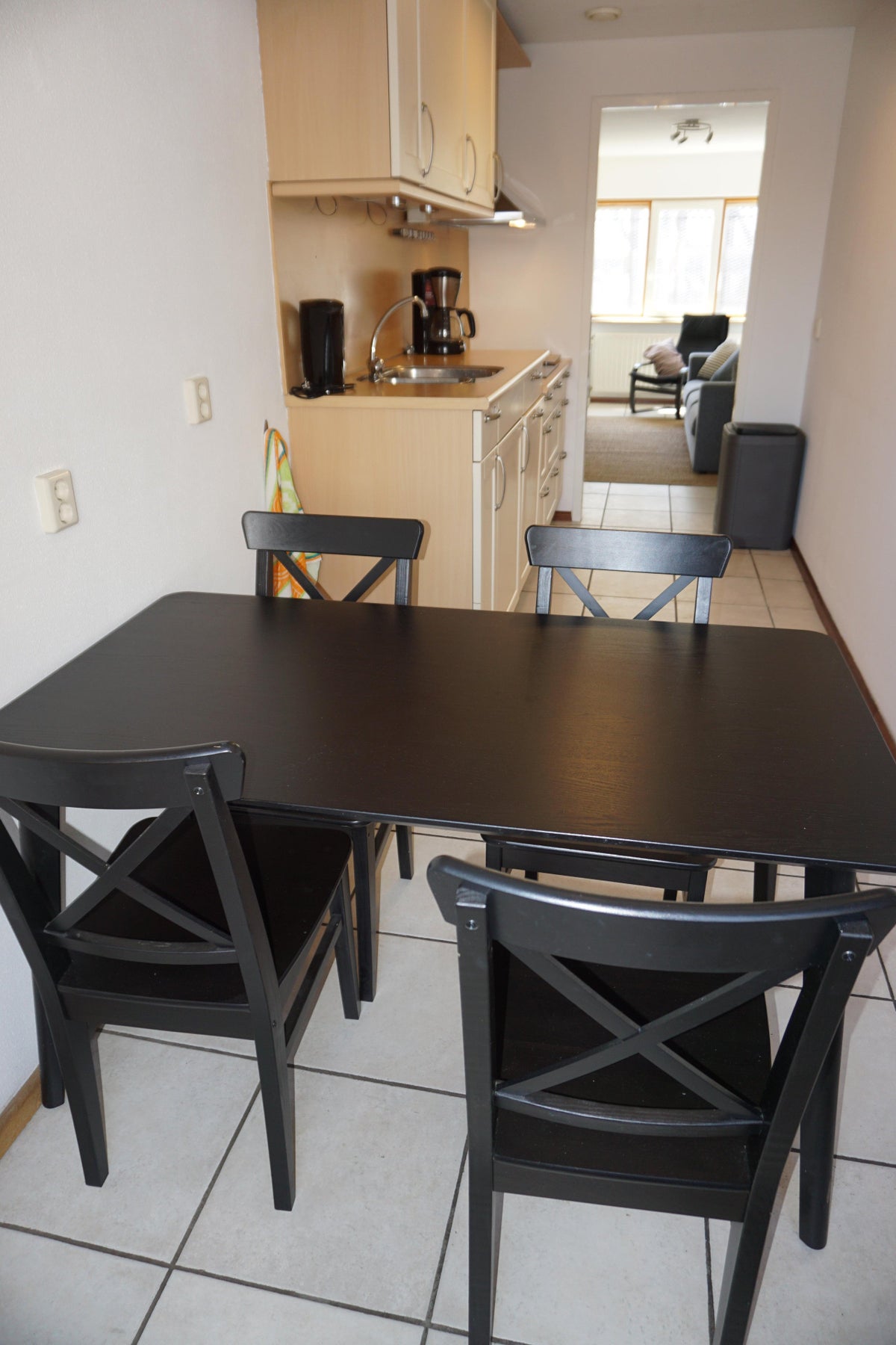 Woonkeuken 5.44 x met een lichte inbouwkeuken, beukendesign werkblad en diverse apparatuur: keramische kookplaat, combimagnetron, afzuigschouw, koelkast en vaatwasmachine.