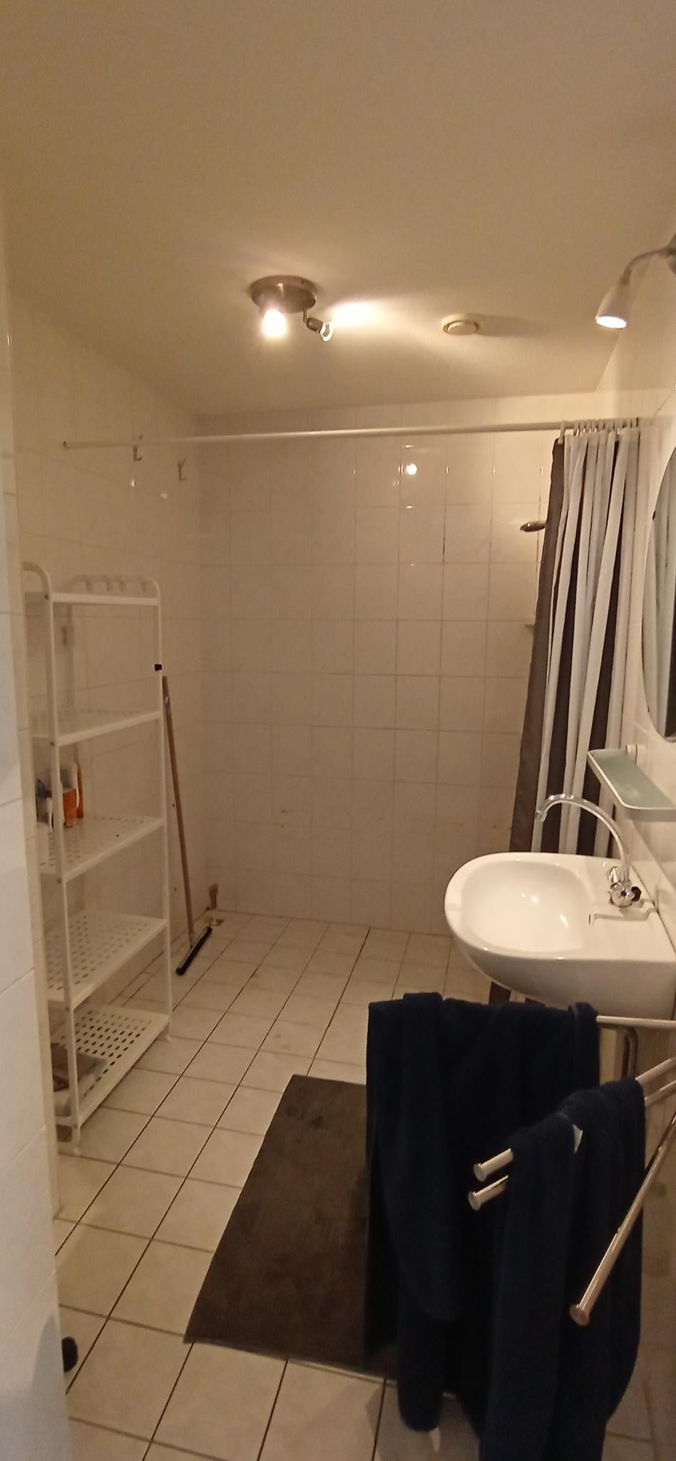 Luxe badkamer 2.88 x 1.88 geheel licht betegeld, hoekligbad met douche en een wastafel.