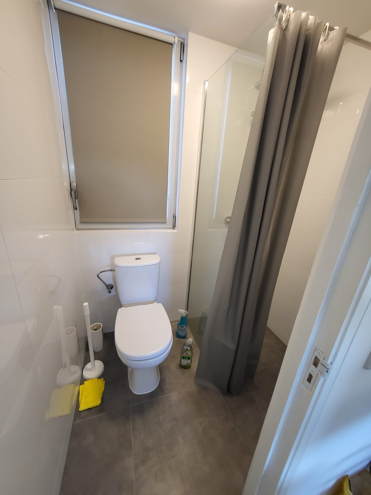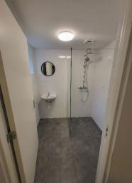 Een eigen badkamer met douche, toilet en wastafel