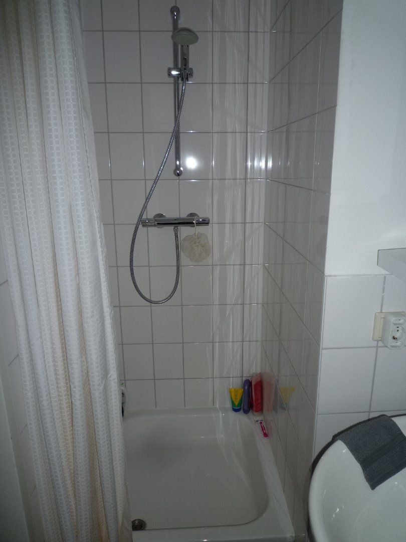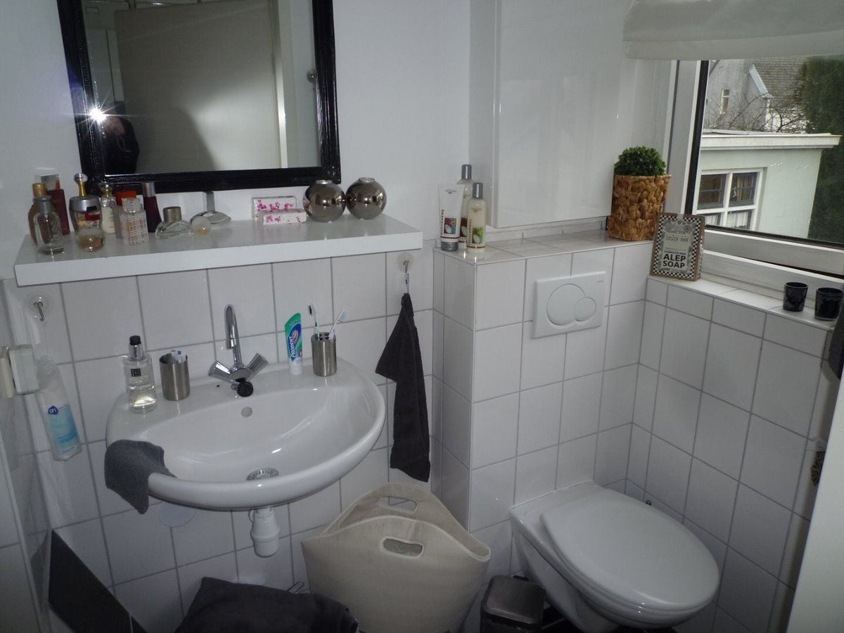 Badkamer, voorzien van douche, wastafel, wasmachineaansluiting en toilet.