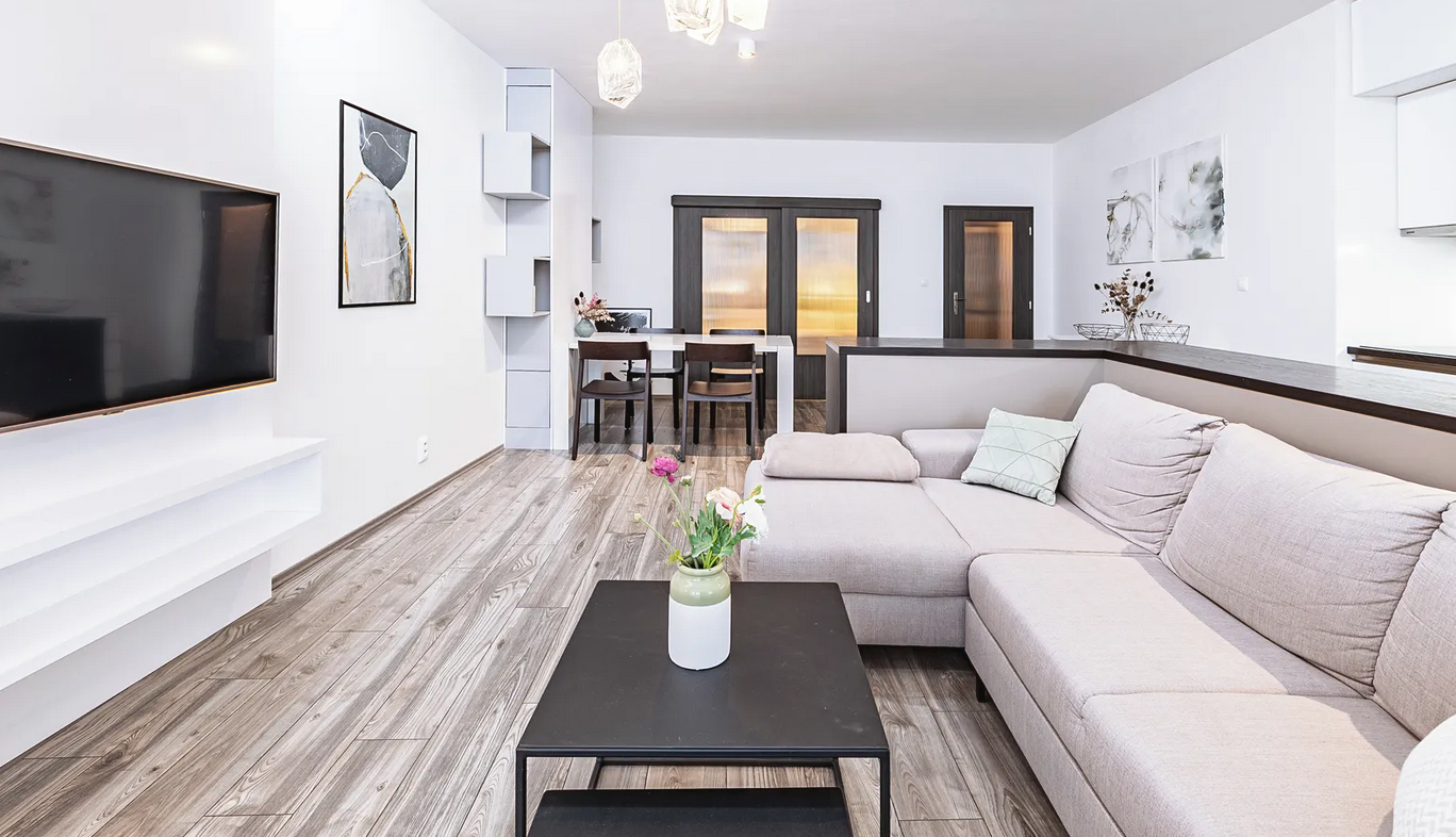 Het appartement is volledig ingericht met meubilair en apparatuur - hydromassagekachel met elektrische oven, magnetron, koelkast met vriezer, wasmachine en tv.