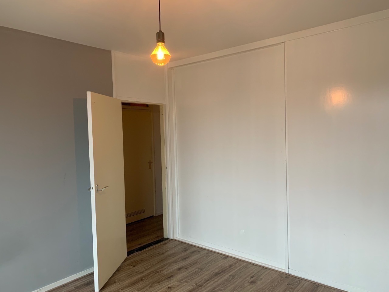 De kamer bevat een laminaat vloer, gordijnen en een lamp.