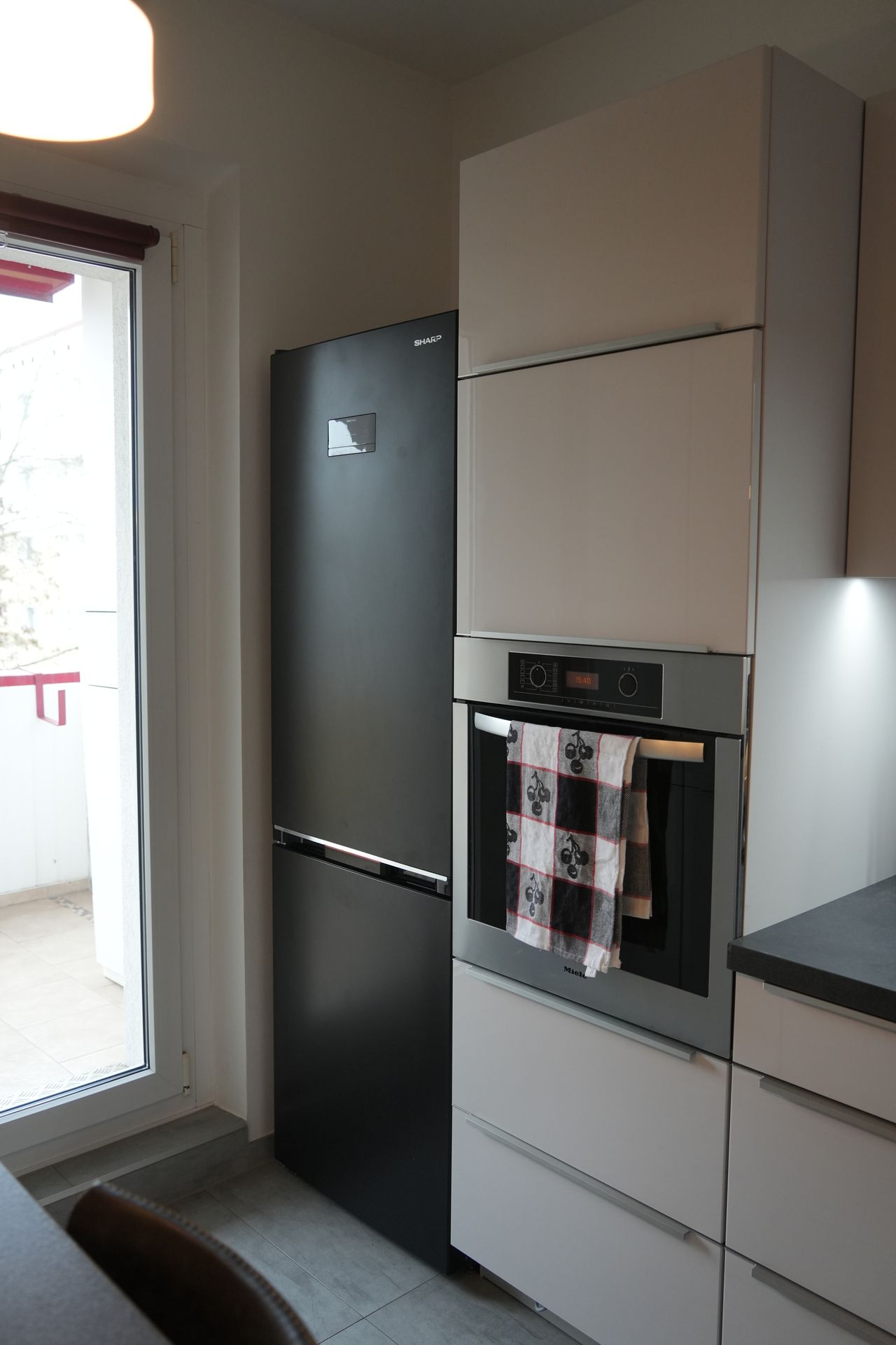 De ruime en lichtovergoten woonkeuken is uitgerust met een moderne inbouwkeuken en biedt directe toegang tot het privébalkon - een perfecte plek om te ontspannen en van de avond te genieten.