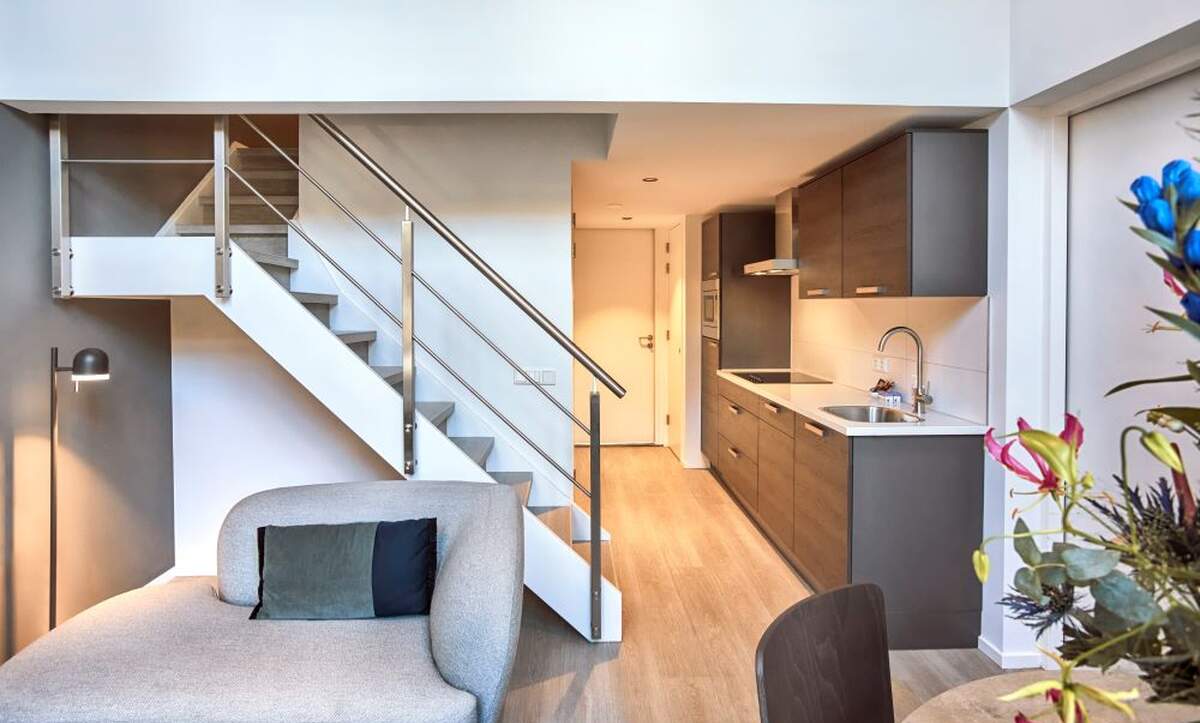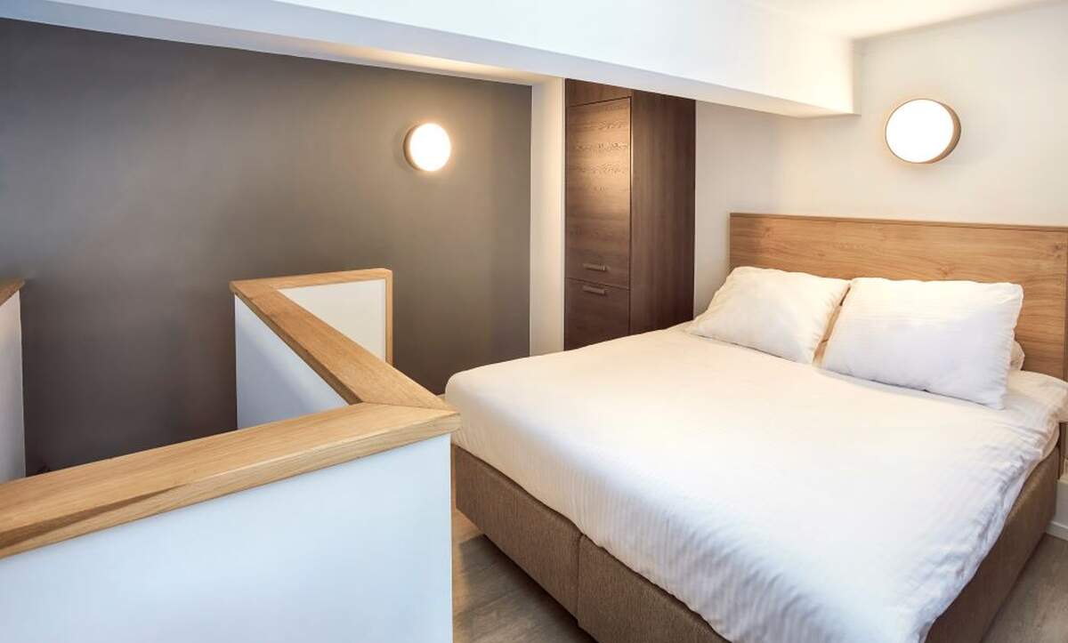 De familiesuite beschikt over een slaapkamer op de begane grond, een slaapzolder, een eigen keuken, een zithoek voor 4 personen en een ruime badkamer..