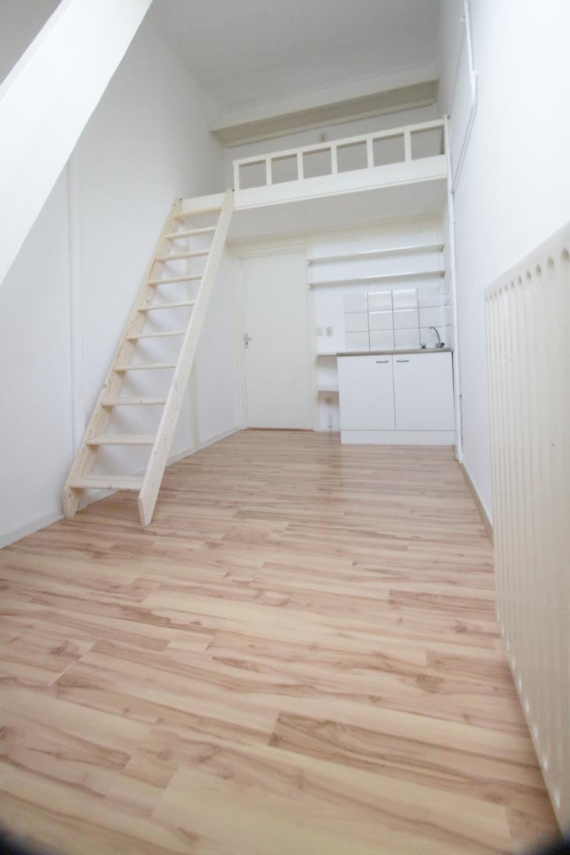 De kamer beschikt over een keuken en een hoogslaper, waardoor de ruimte praktisch en efficiënt is ingericht.