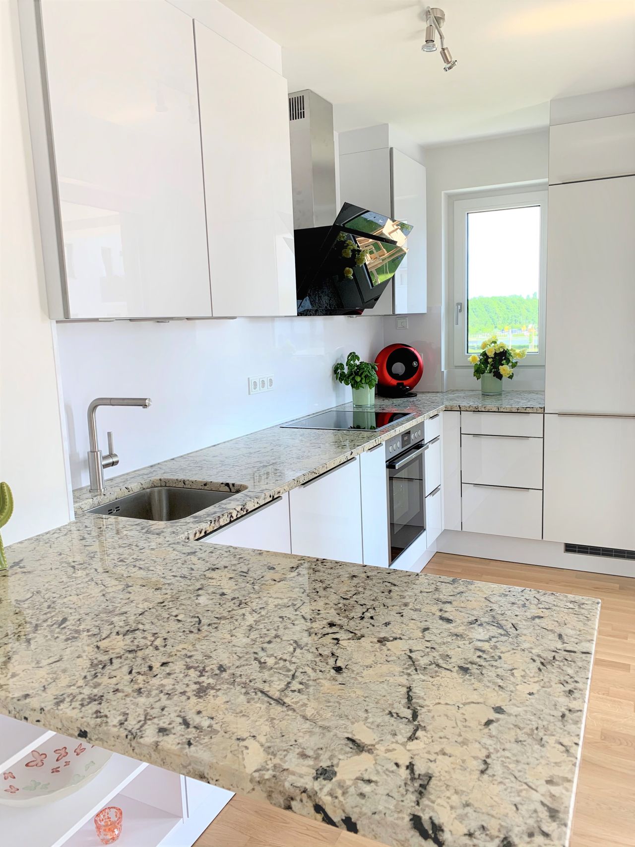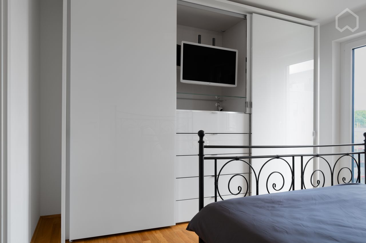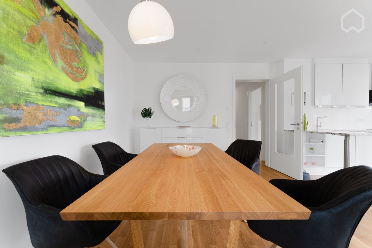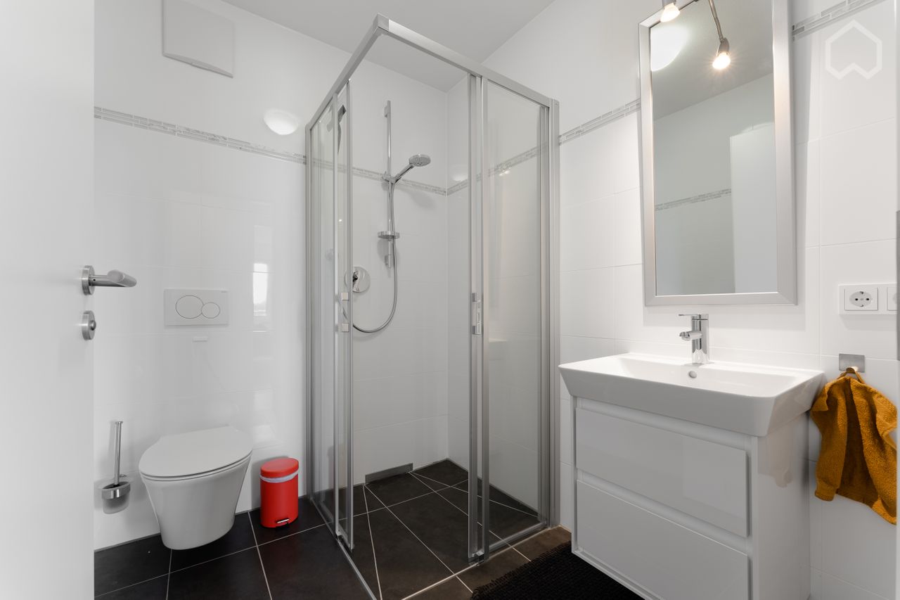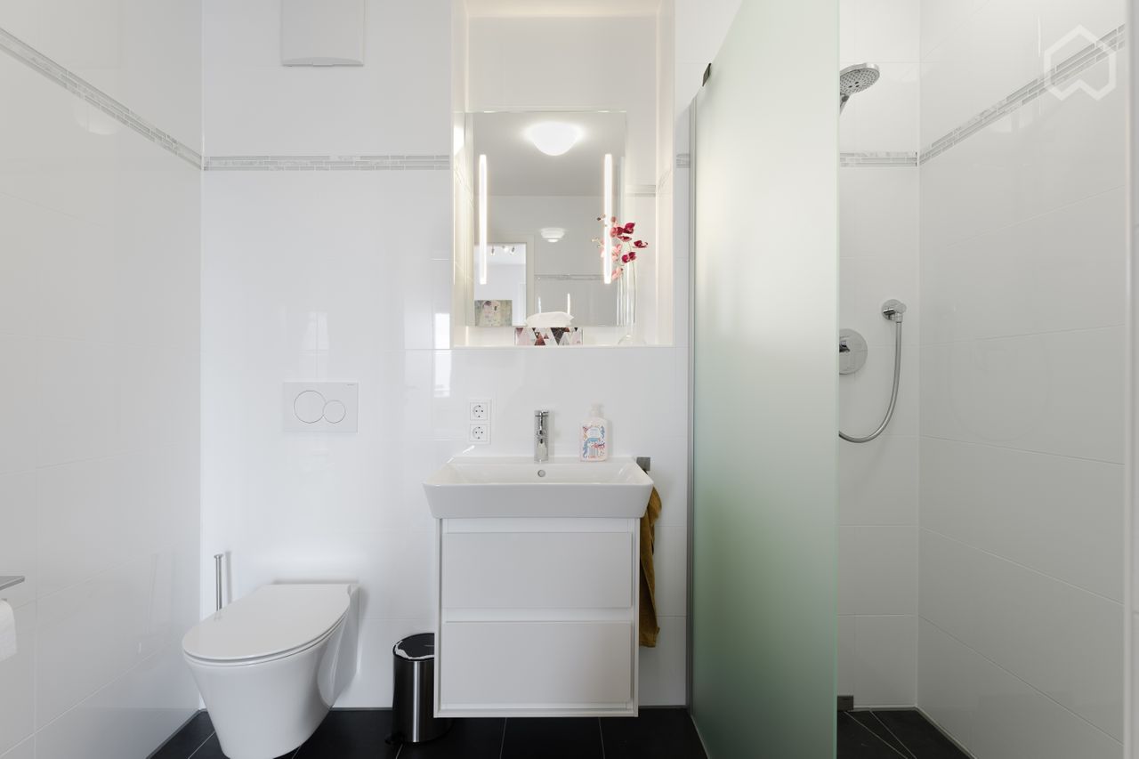 Aparte keuken met hoogwaardige keukeninrichting van het merk Musterring met vaatwasser, oven, jaren 80 inductie kookplaat, inbouw magnetron. ruime badkamer met ligbad en wasmachine.