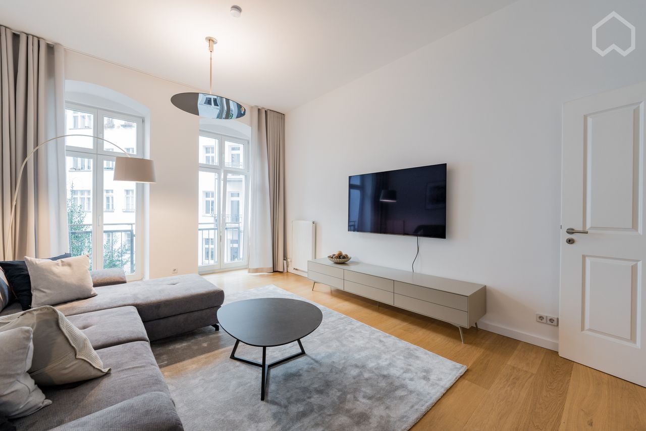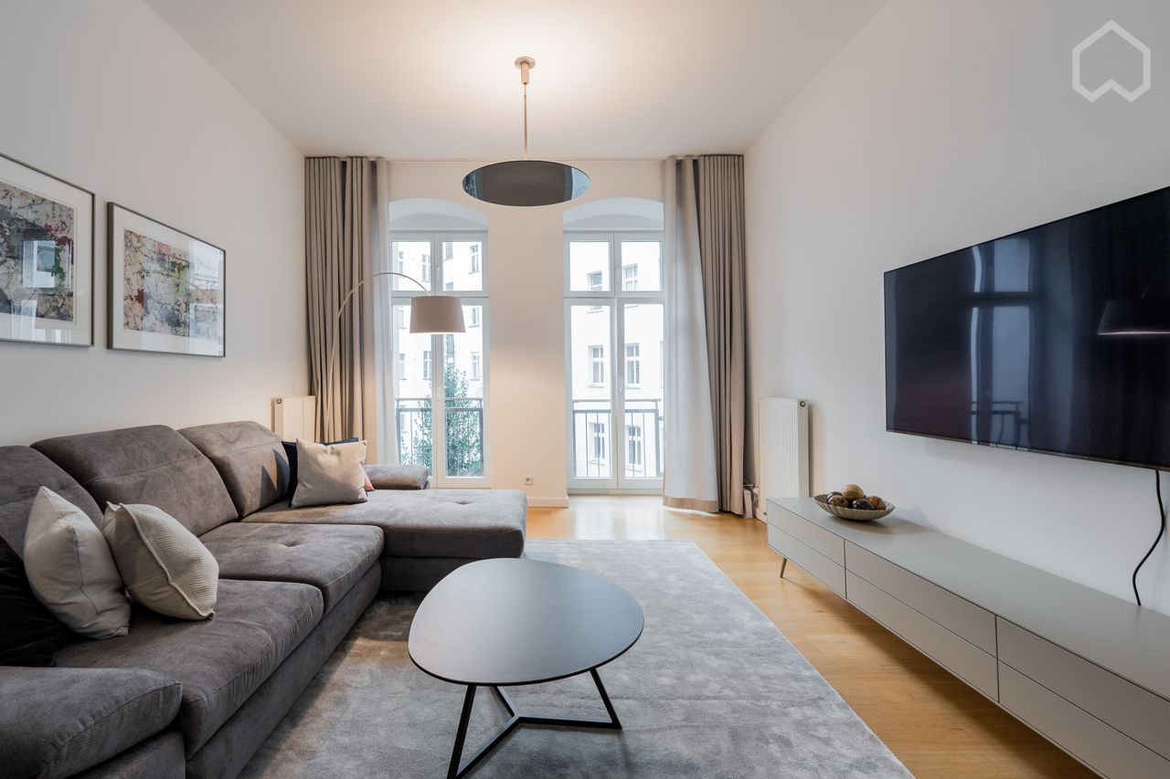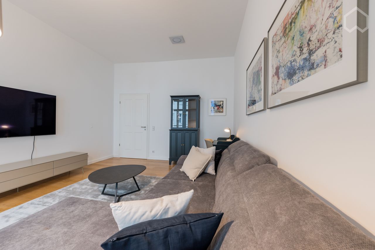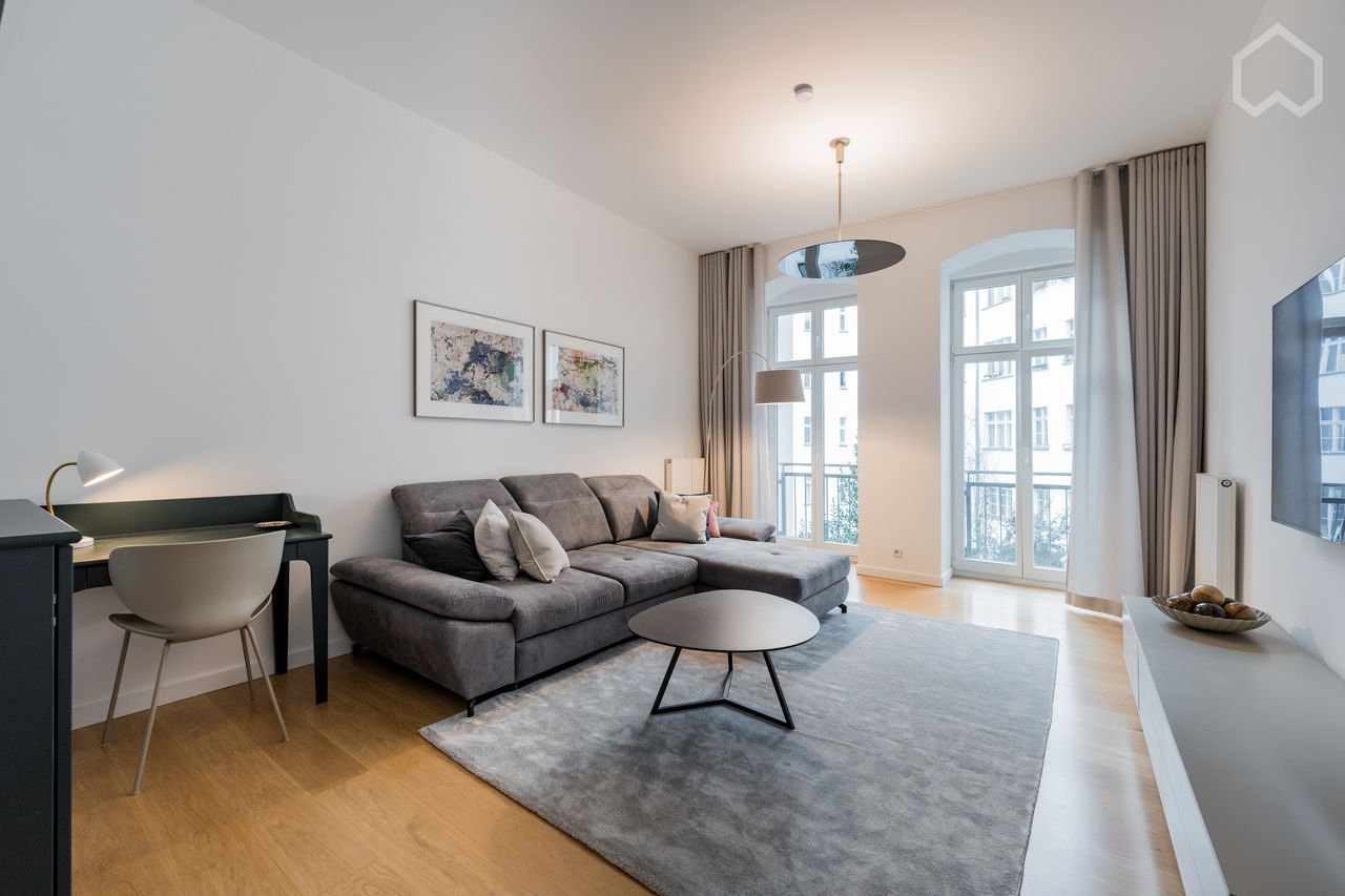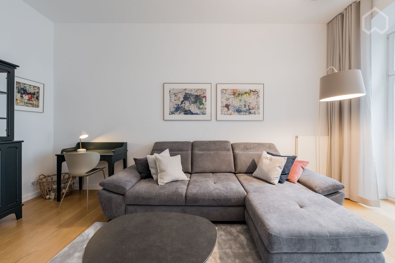 Nieuw ingericht appartement, centrale woonkamer met kantoor aan huis, comfortabele bank en grote ramen van vloer tot plafond.