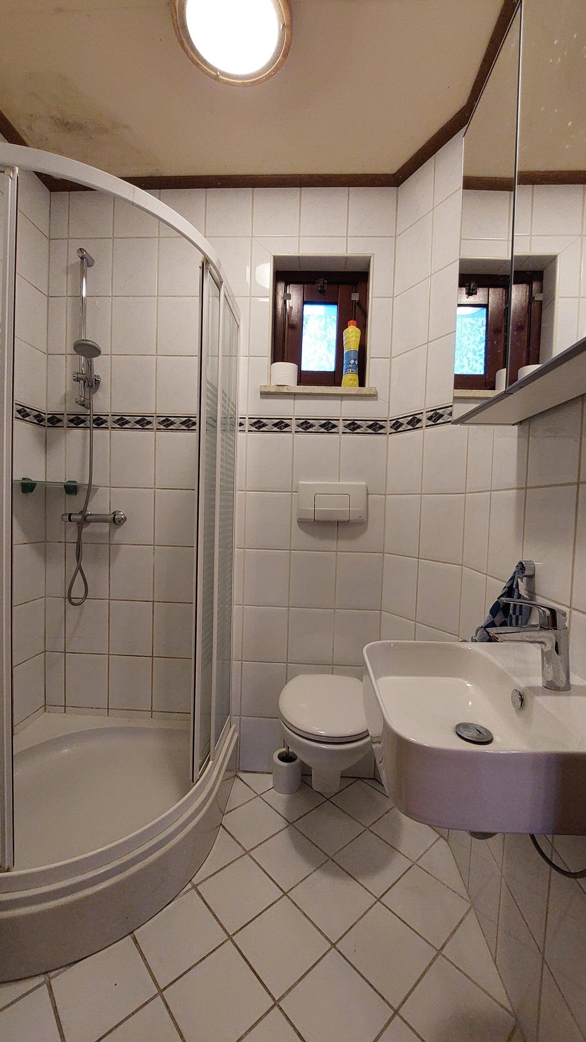 Nette badkamer met toilet, douchecabine en wastafel.