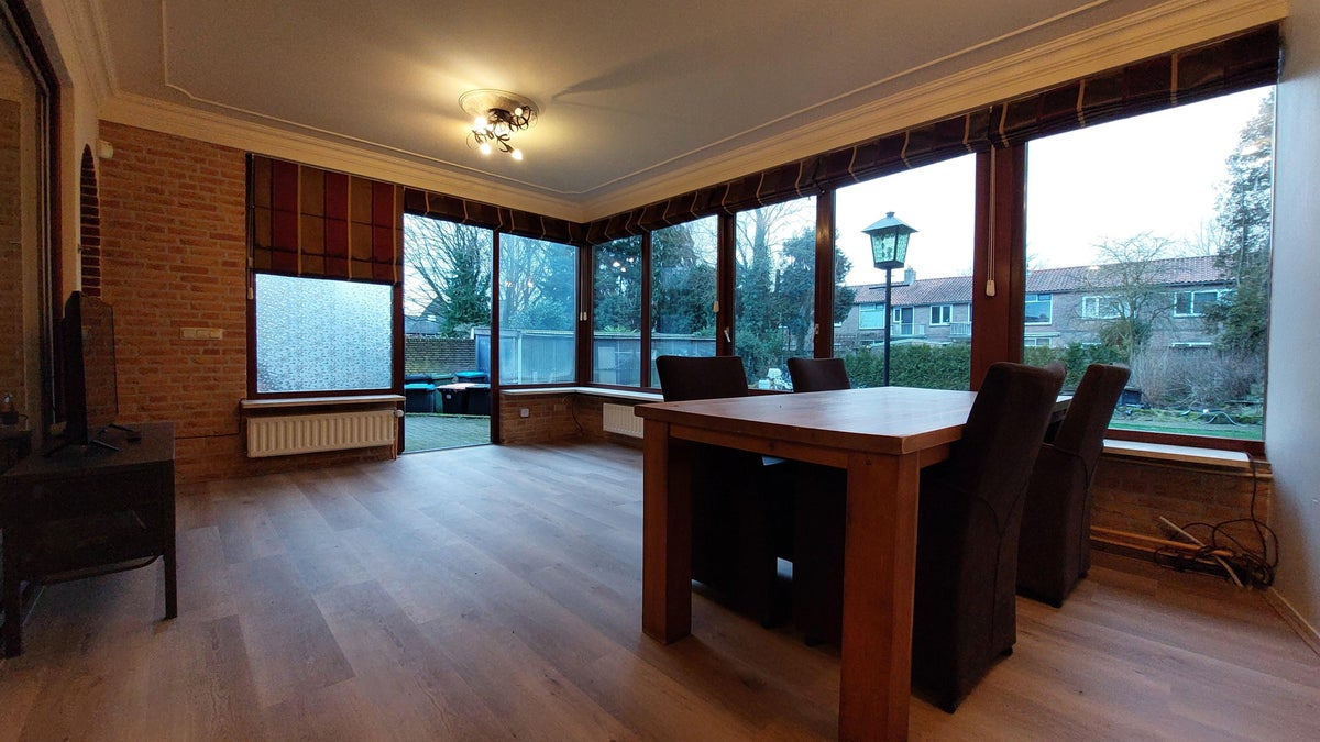 Ruime woonkamer met veel lichtinval door grote raampartijen met uitzicht en direct toegang tot de achtertuin. Toegang tot een slaapkamer van ongeveer 14 m².