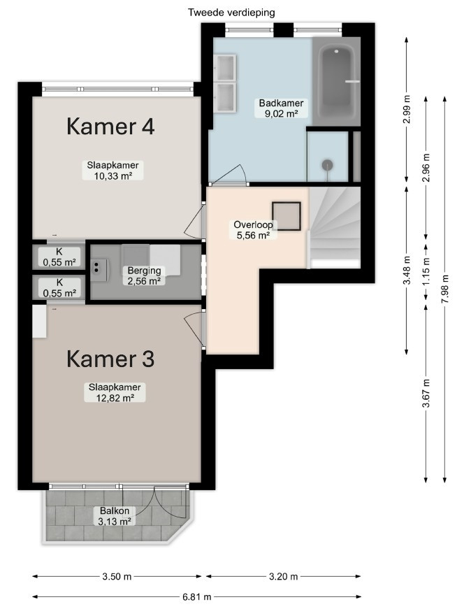 De woning wordt gedeeld met drie medebewoners. Op de tweede verdieping bevinden zich de gedeelde badkamer, een berging en twee slaapkamers. De recent vernieuwde keuken is voorzien van een inductieplaat, inbouwkoelkast en combi-oven. De badkamer is voorzien van een bad, douche en ruime wastafel.