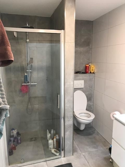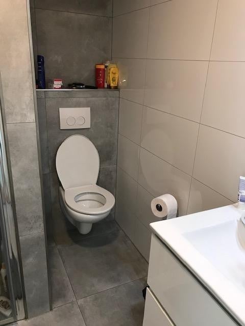 De gemeenschappelijke badkamer is voorzien van een douchecabine, wastafel met wastafelmeubel, spiegel met verlichting en toilet.