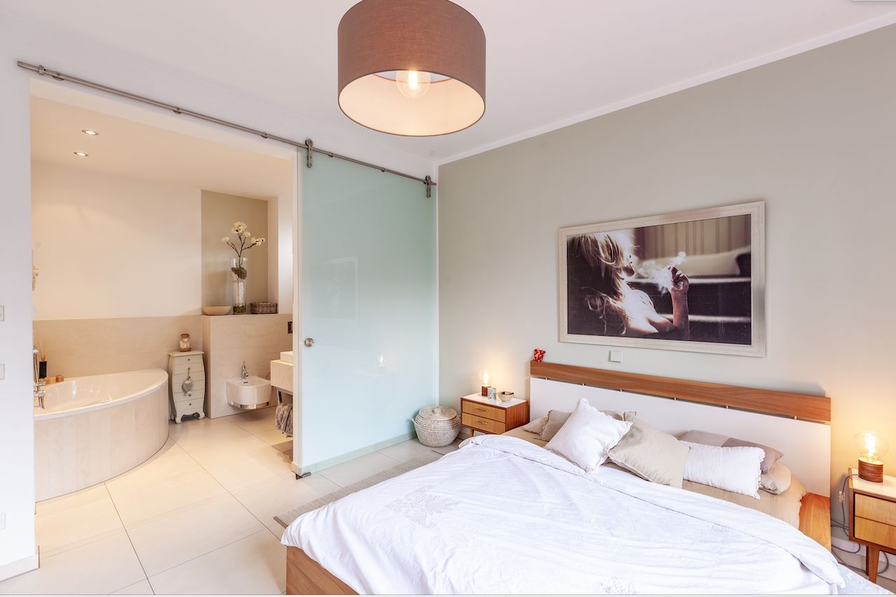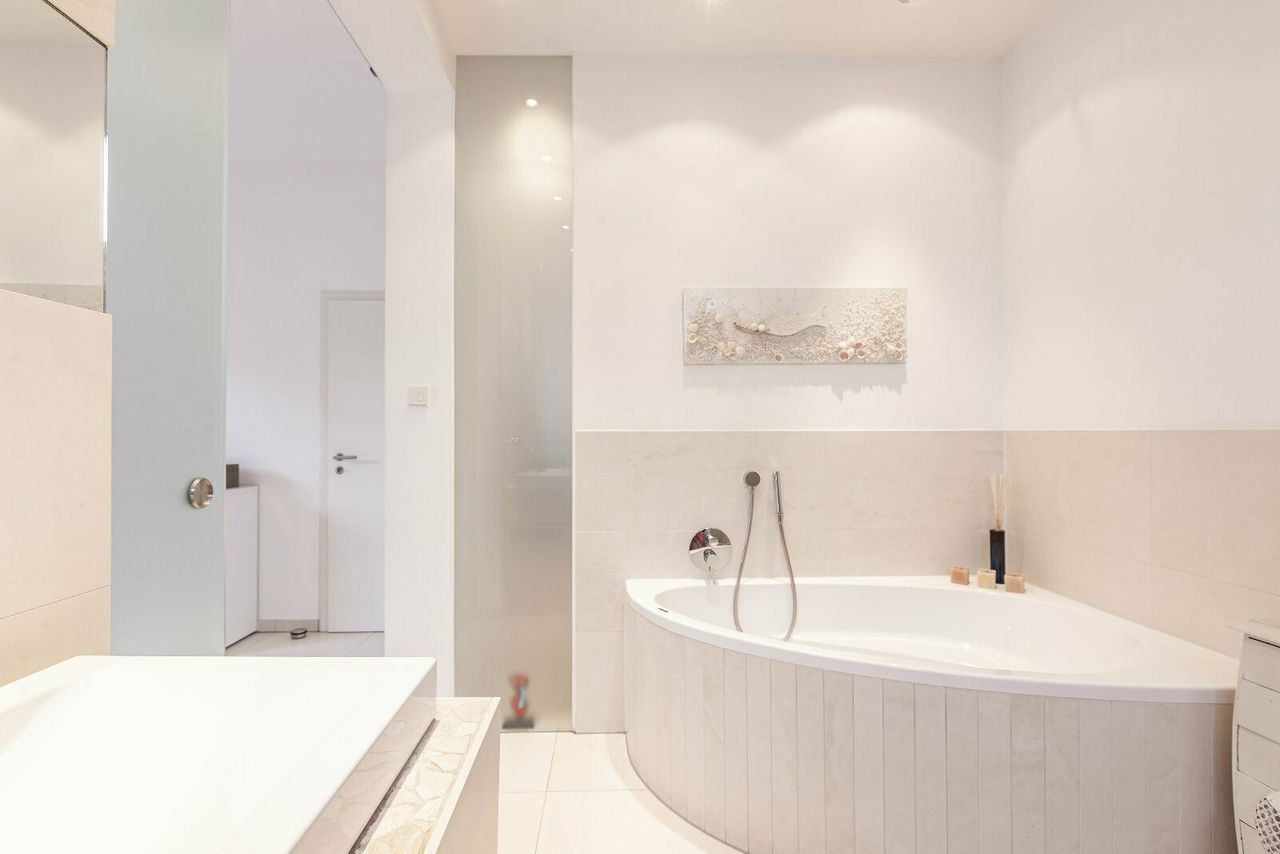 Hoofdbadkamer met hoekbad en grote glazen schuifdeur waardoor u tijdens het baden kunt genieten van een fantastisch uitzicht op de tuin. Snelle WiFi door het hele huis en ook in de tuin. Wasmachine / droger, Nespresso-apparaat..