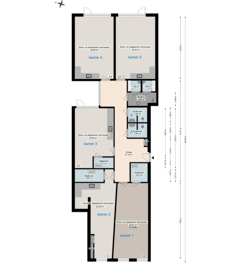 Bij binnenkomst in de woning kom je eerst in de hal, die toegang geeft tot de gemeenschappelijke toiletten en alle kamers. De gerenoveerde kamers hebben gemiddeld een oppervlakte van 20 m² en hebben allemaal een eigen badkamer en keuken, voorzien van een inductiekookplaat, afzuigkap, koelkast en een combinatie oven/magnetron. Tevens beschikken drie kamers over een eigen tuin. Huurprijs en borg De huurprijs van kamer 1 bedraagt €895,- per maand inclusief een voorschot van €75,- op gas, water, elektra, televisie en internet.