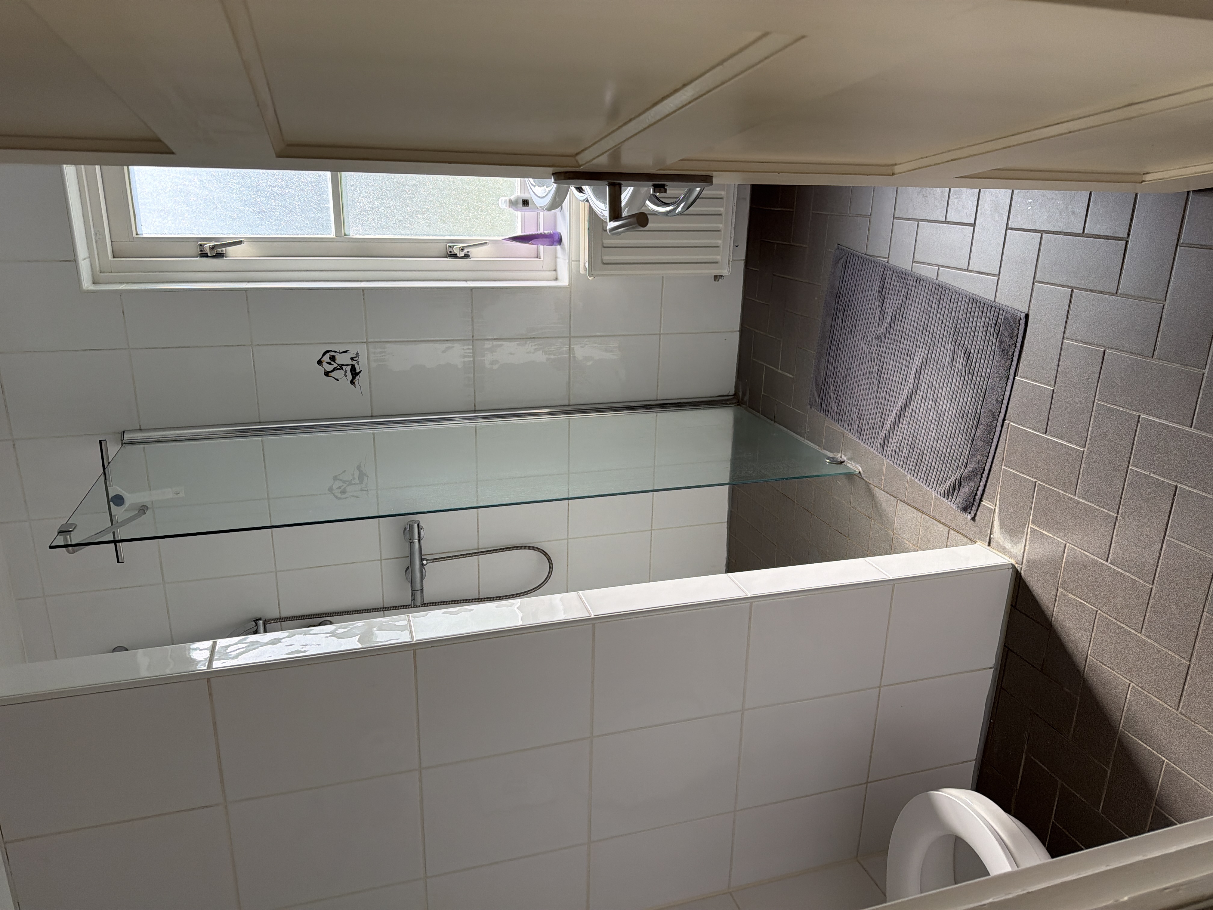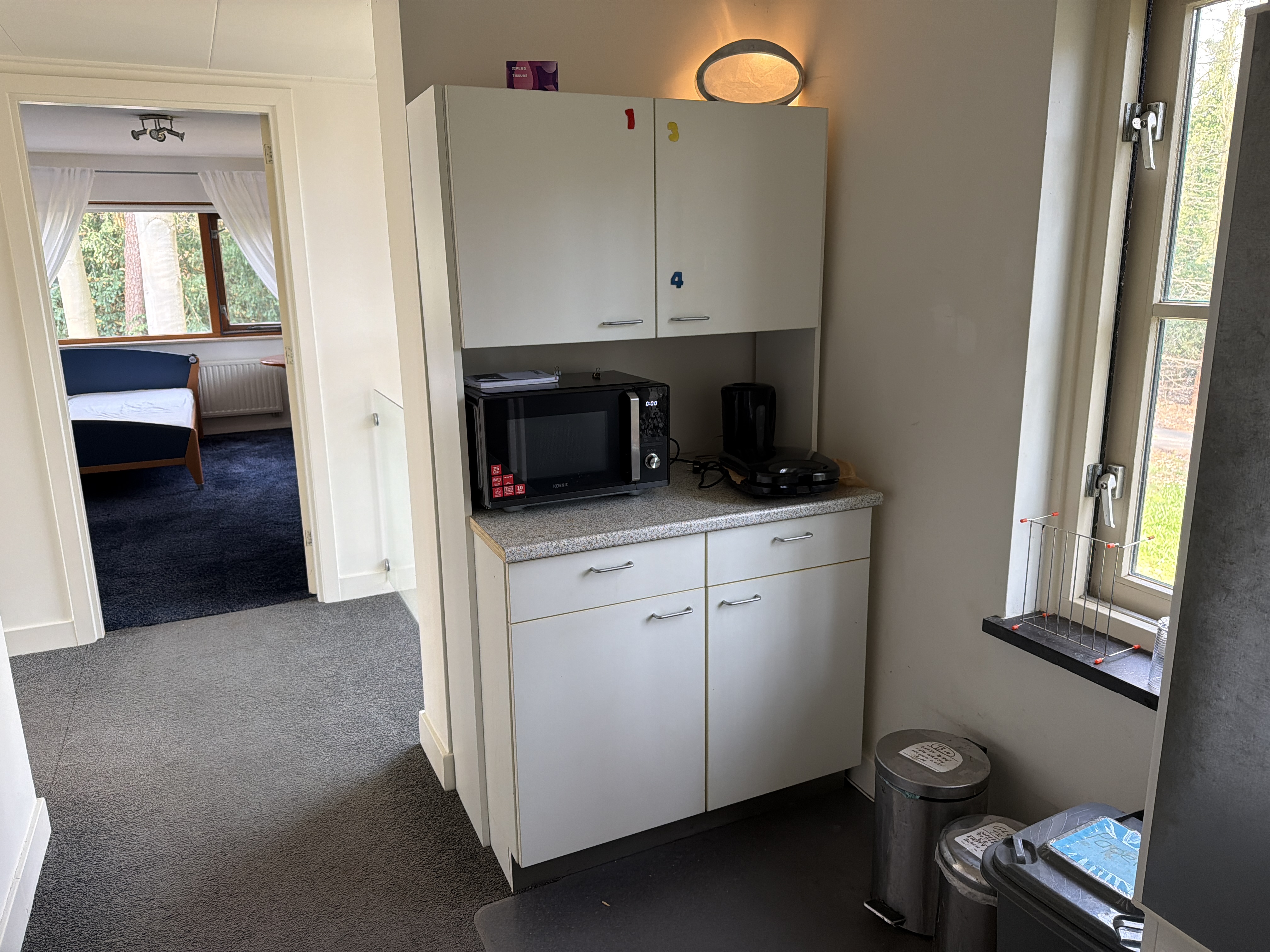 Op de overloop is een kitchenette met koffiemachine, broodrooster, waterboiler, magnetron en koel/vrieskast gedeeld met andere gasten.