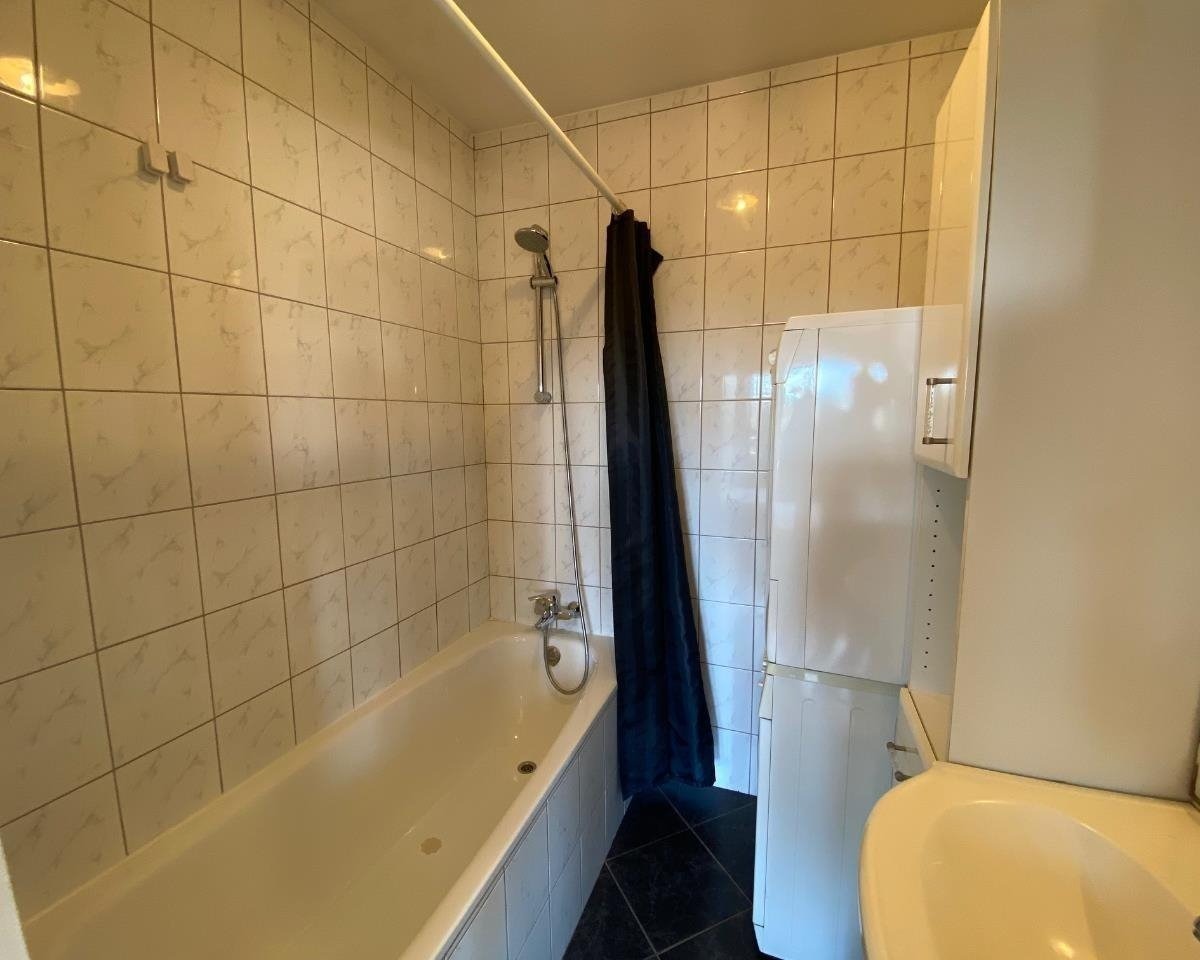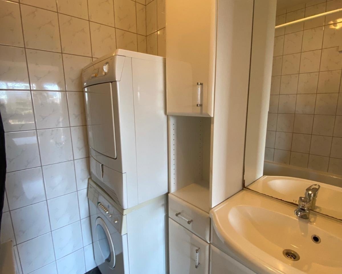 Badkamer ruimte: Vanuit de slaapkamer bereikbare, geheel betegelde, verzorgde badkamer met bad/douchecombinatie, vaste wastafel in badkamer meubel met onder- en zijkasten en aansluitingen voor was- en droogautomaat.