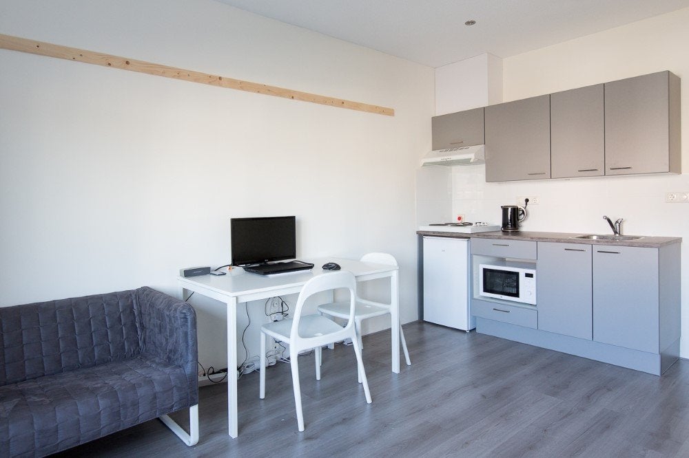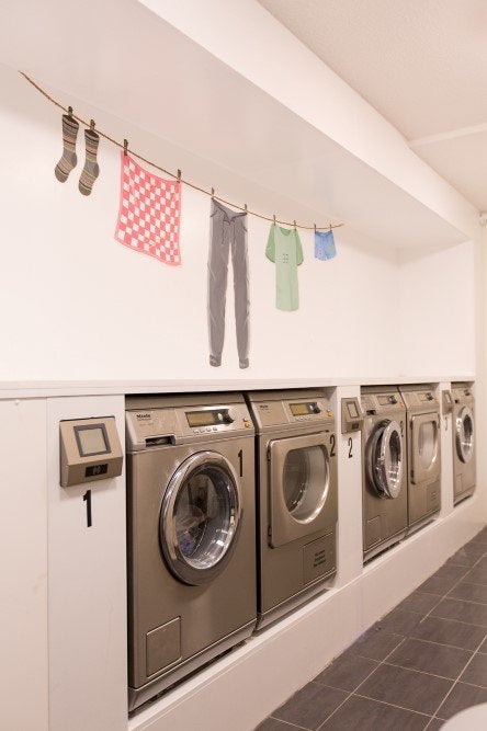 Alle woonruimten delen de wasruimte, zodat de studio optimaal kan worden gebruikt en er geen ruimte verloren gaat door het plaatsen van een wasmachine.