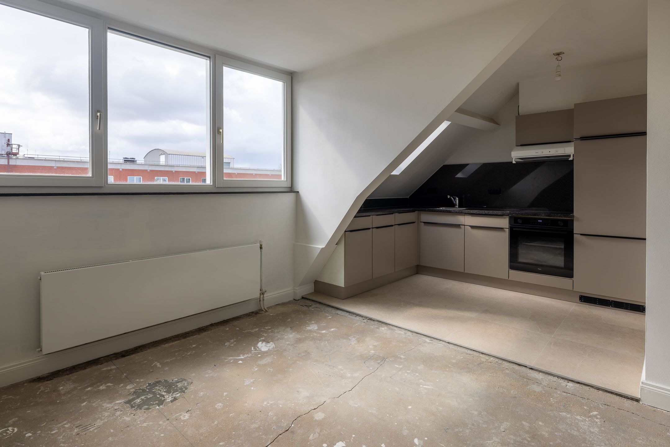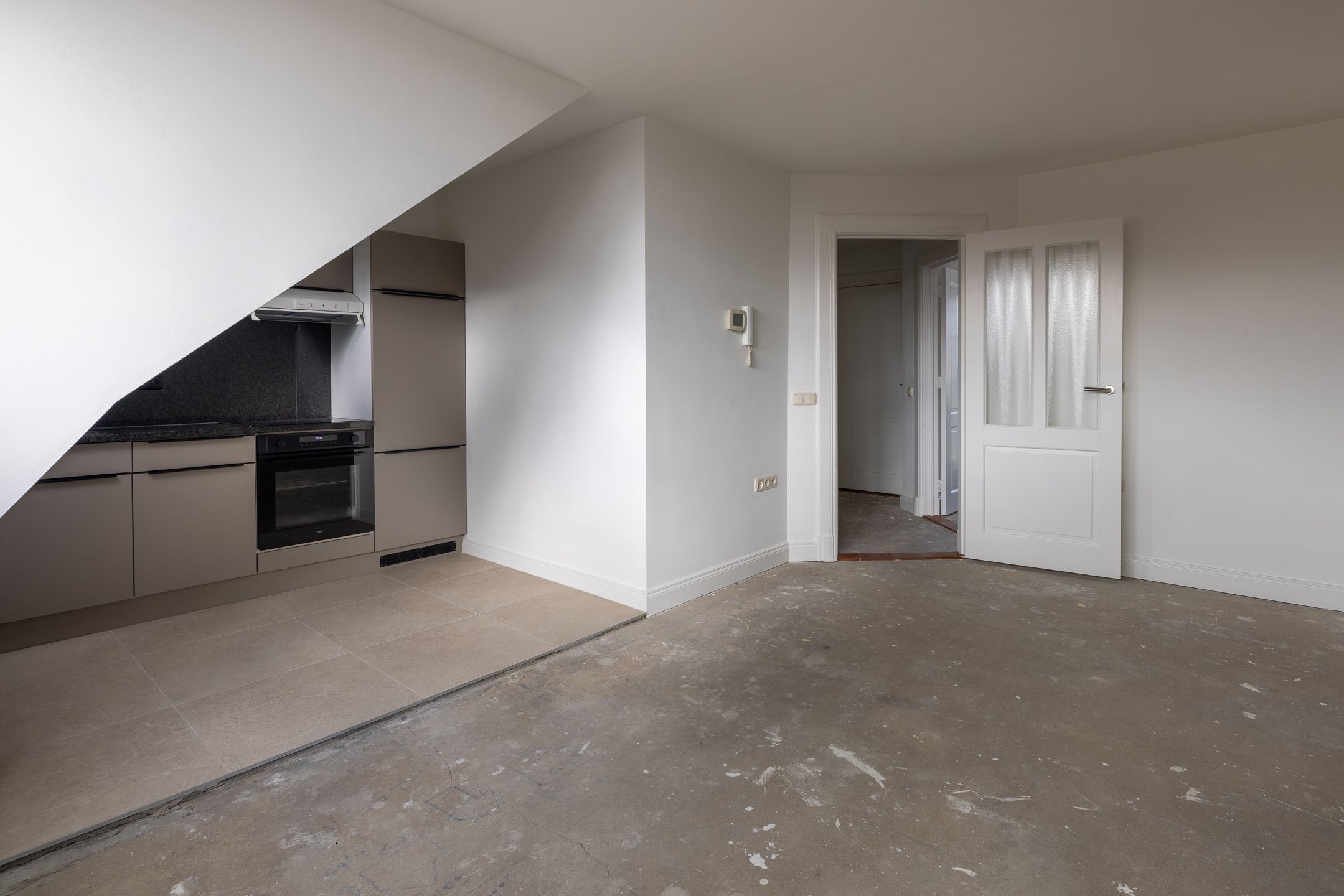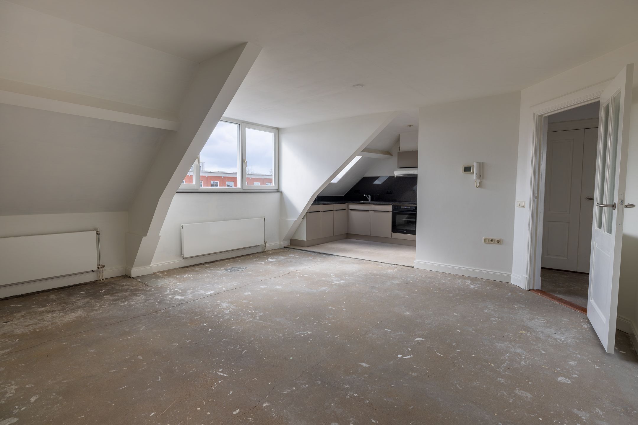 De woning beschikt over een lichte woonkamer met open keuken, wat zorgt voor een ruimtelijk en modern geheel. De keuken is praktisch ingericht en biedt voldoende opbergruimte.