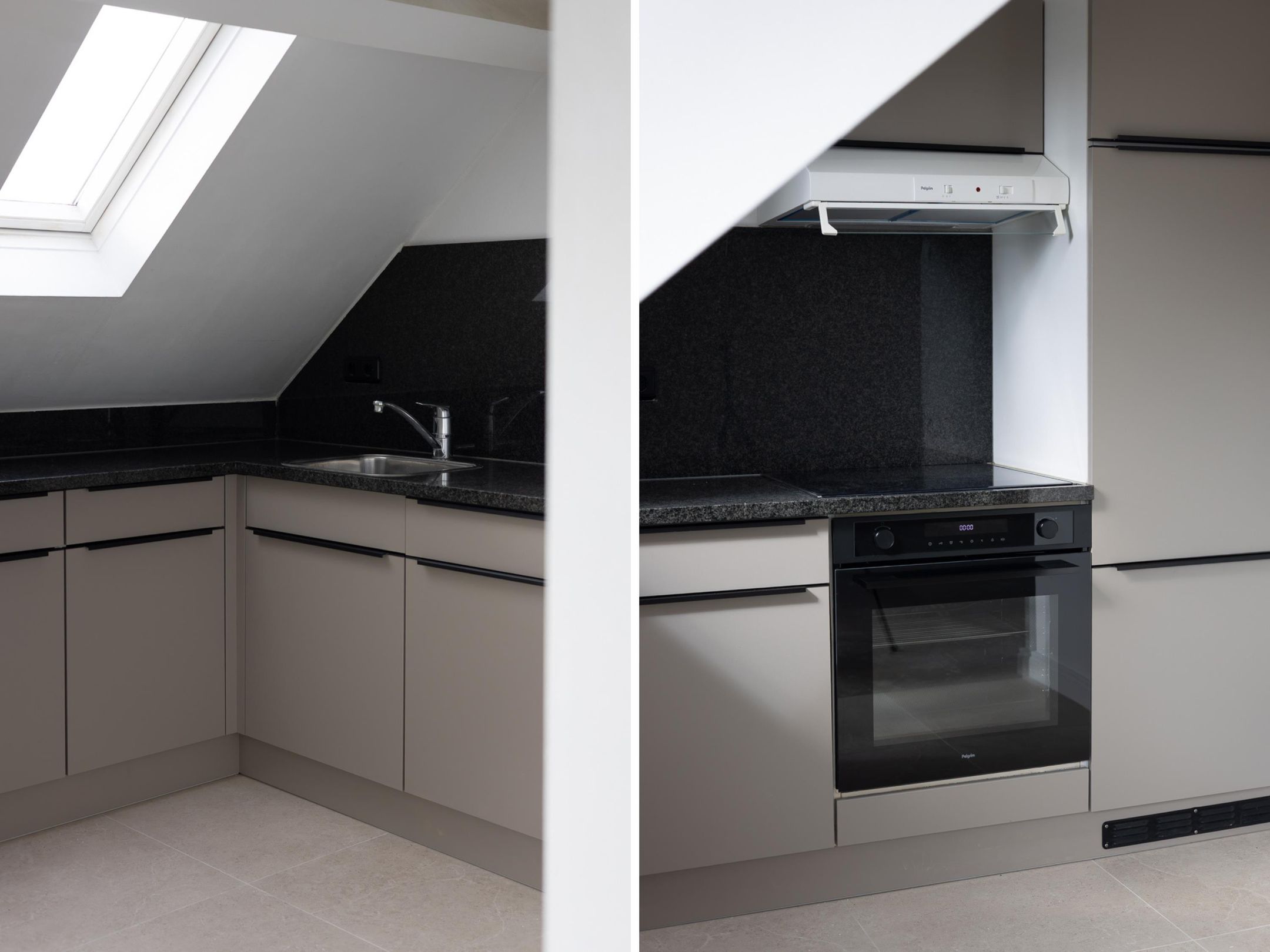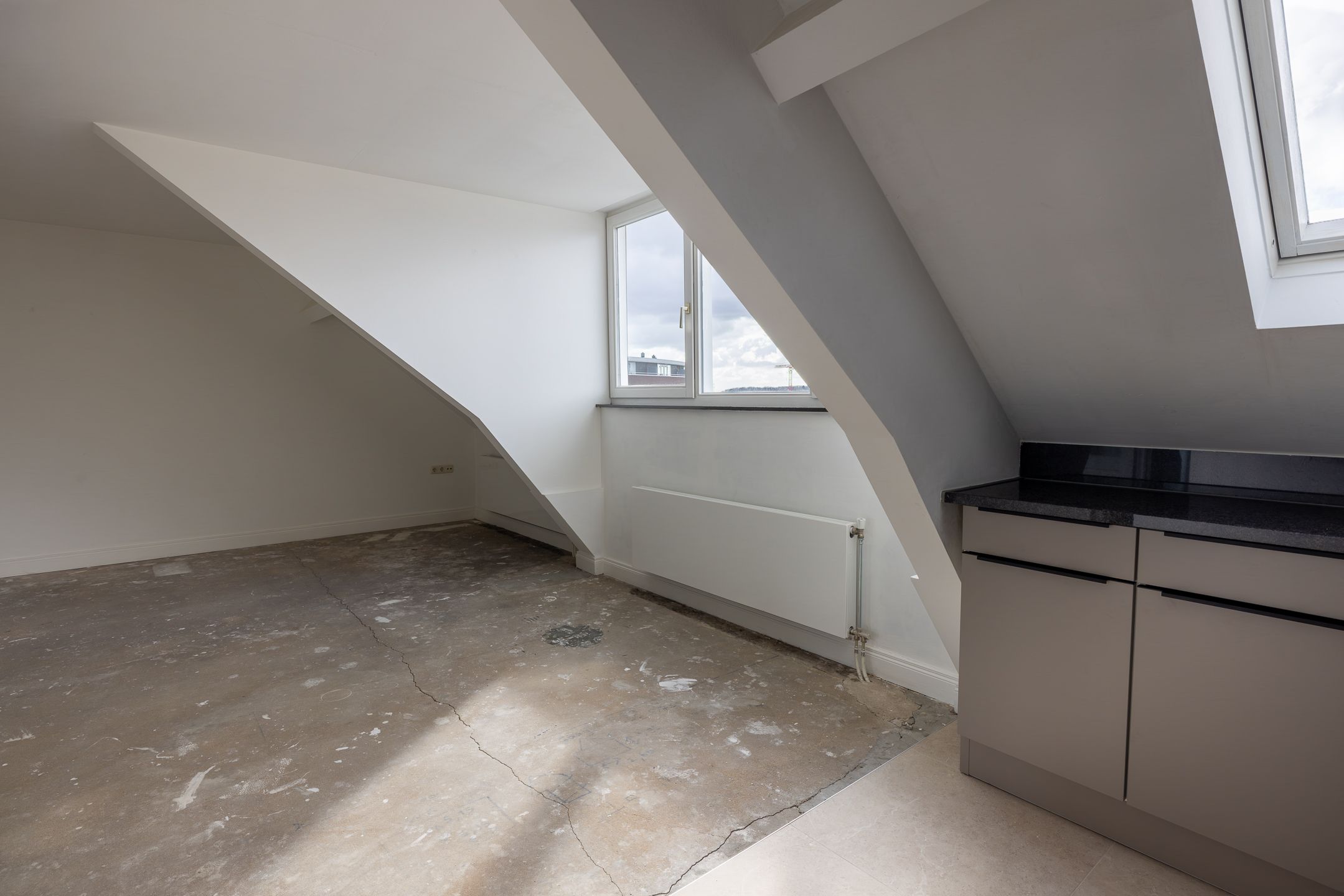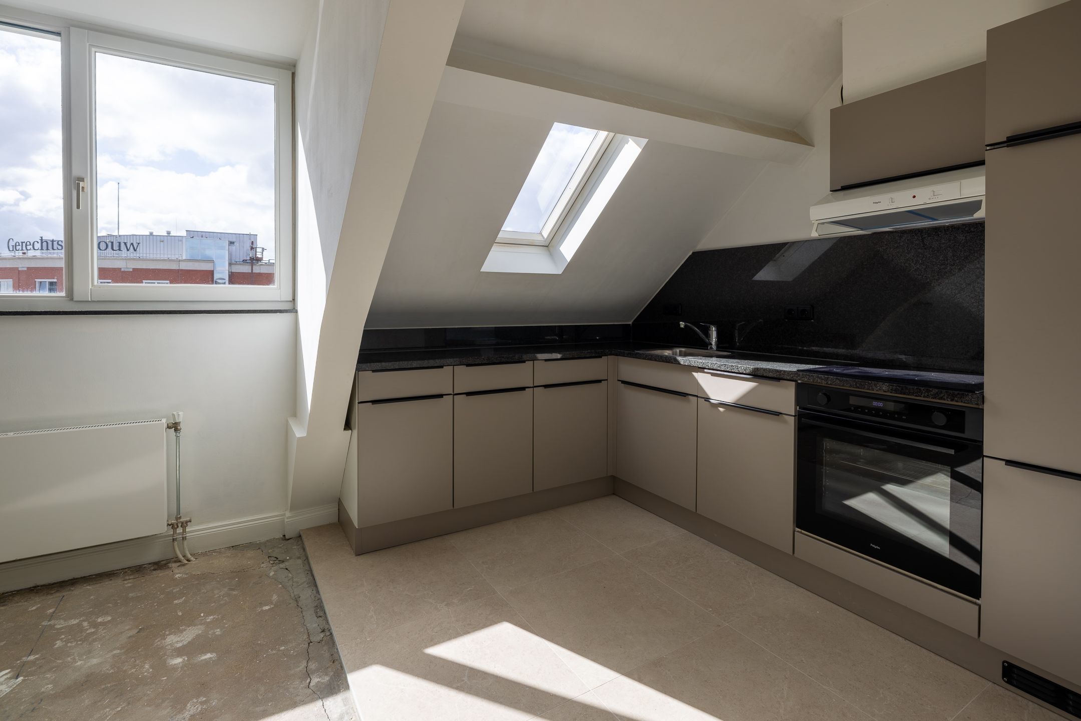 De woning beschikt over een lichte woonkamer met open keuken, wat zorgt voor een ruimtelijk en modern geheel. De keuken is praktisch ingericht en biedt voldoende opbergruimte.
