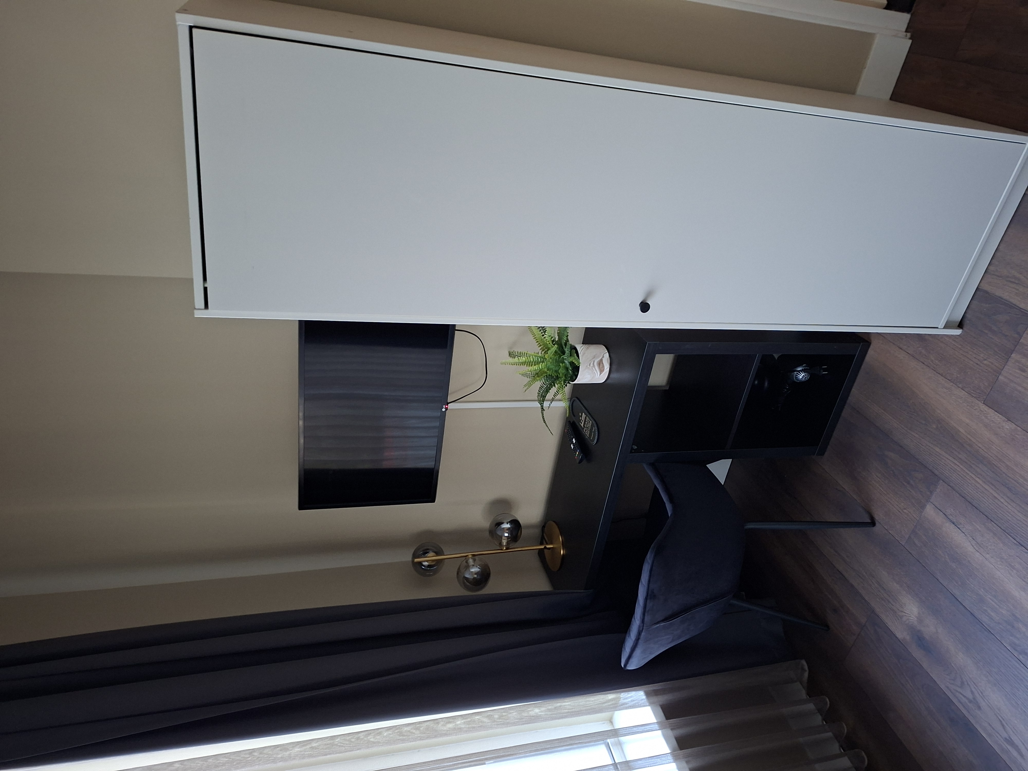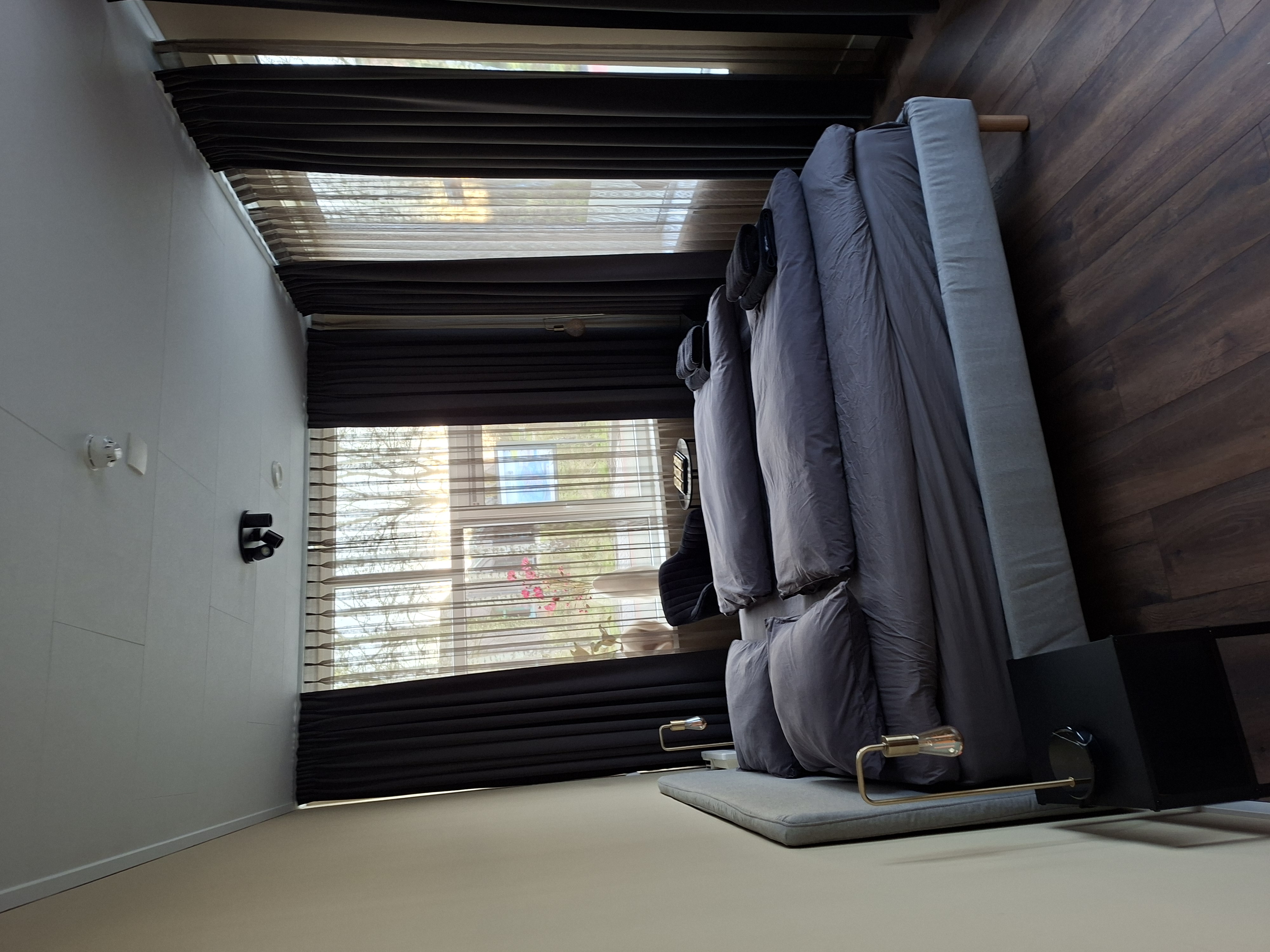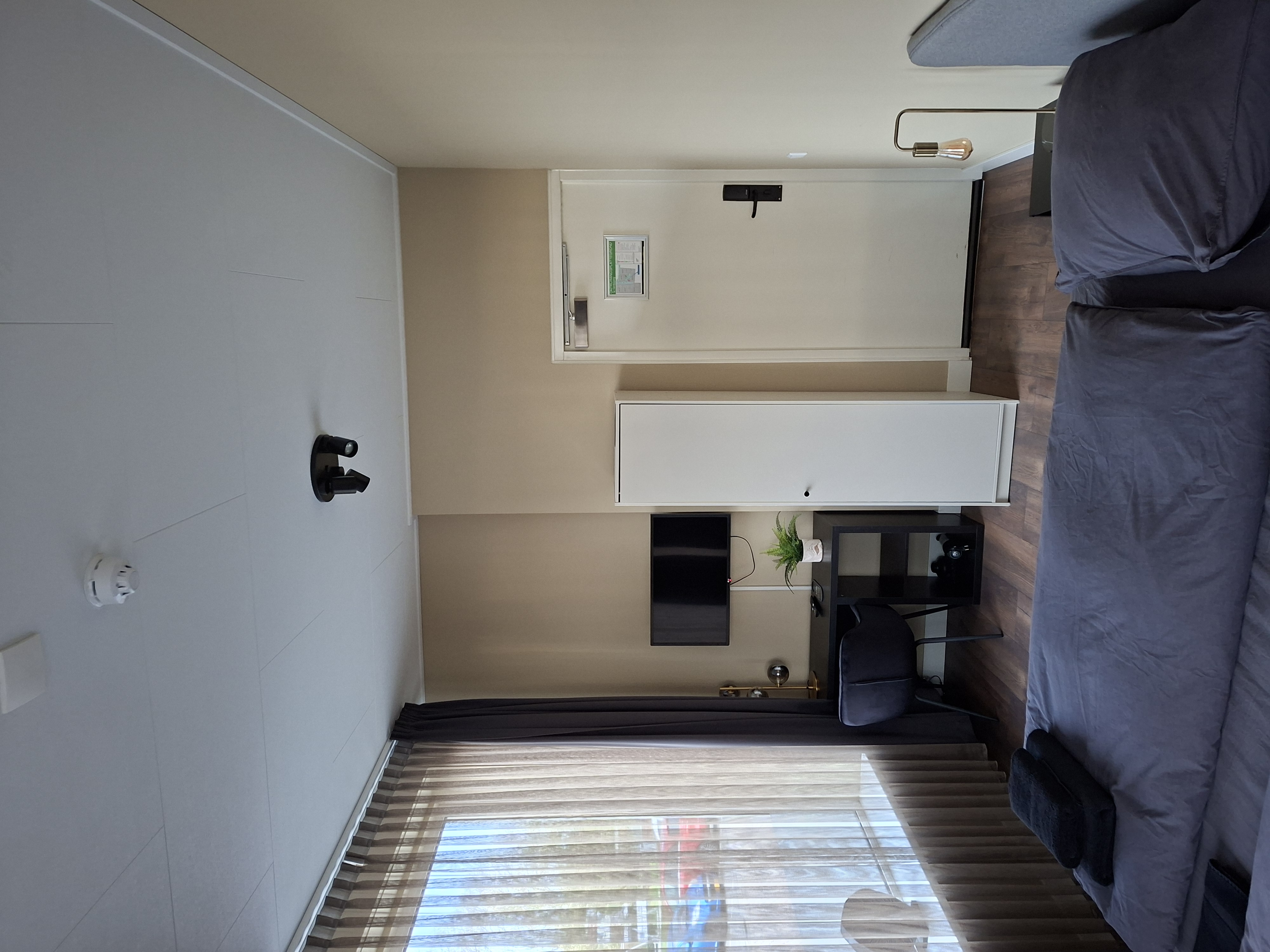 Ruime kamer voorzien van groot bed, smart tv, koelkast, magnetron, bureau, zitje, kledingkast.