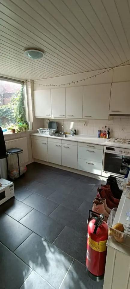 Als huis delen we de onderste verdieping. Hier is een zeer ruime gemeenschappelijke woonkamer, een grote keuken en een gemeenschappelijke badkamer/wc aanwezig. Achter het huis is er een tuintje en een schuurtje waar je je fiets kwijt kan, waar in ook de wasmachine en droger te vinden zijn.