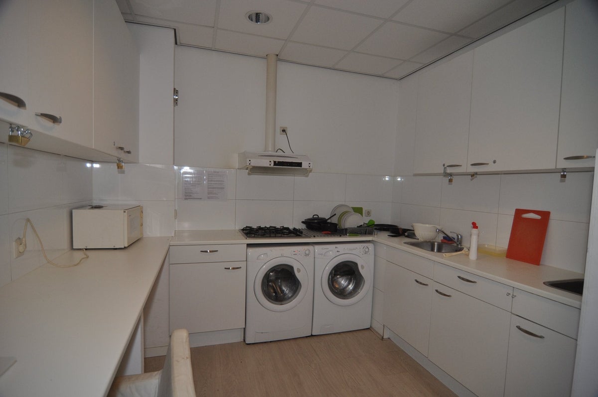 Die bevinden zich allemaal op de eerste verdieping. De gezamenlijke keuken beschikt over een kookplaat en afzuigkap. Via de verlichte achterom is een klein deel van de tuin beschikbaar voor fietsen.