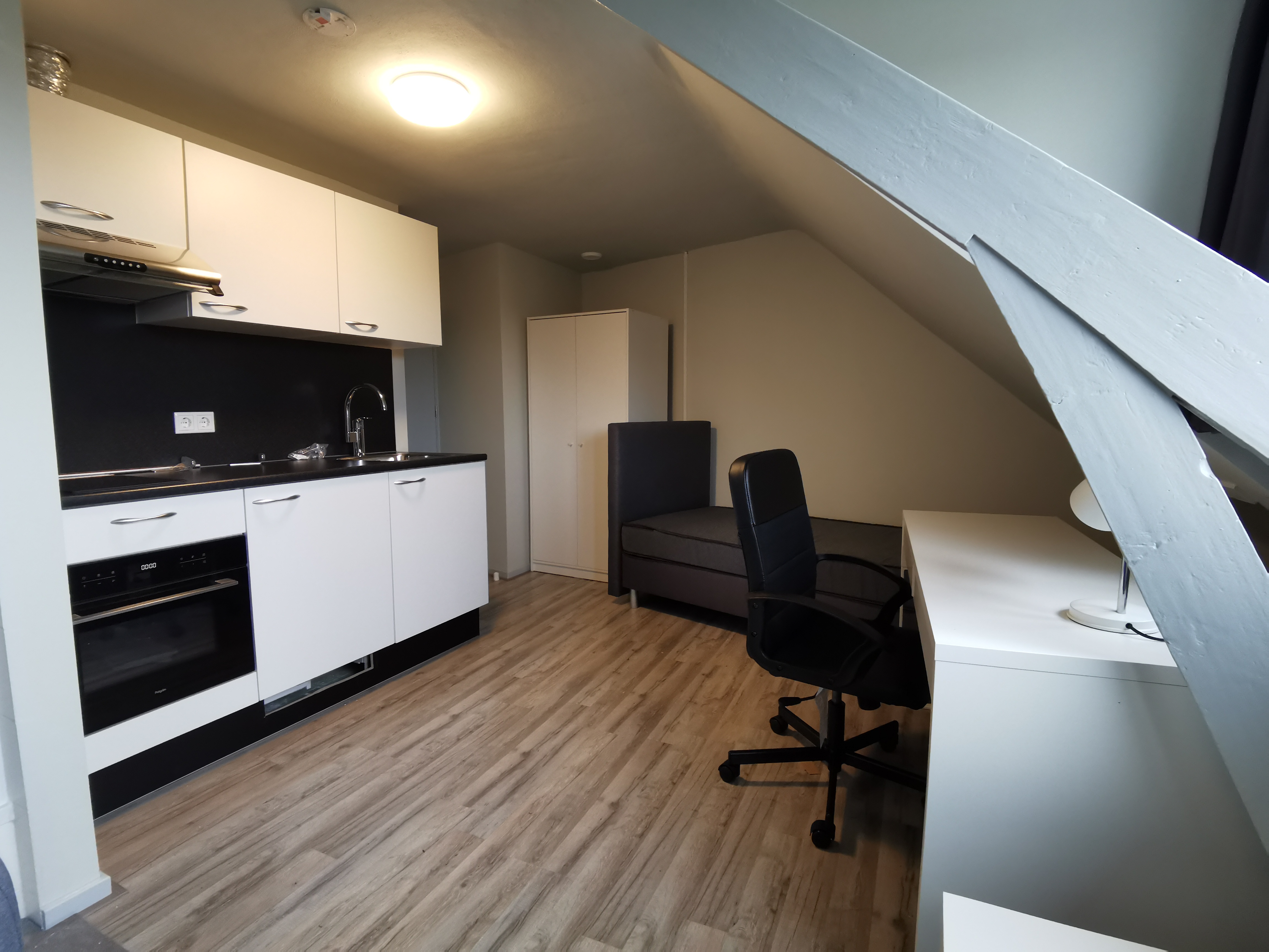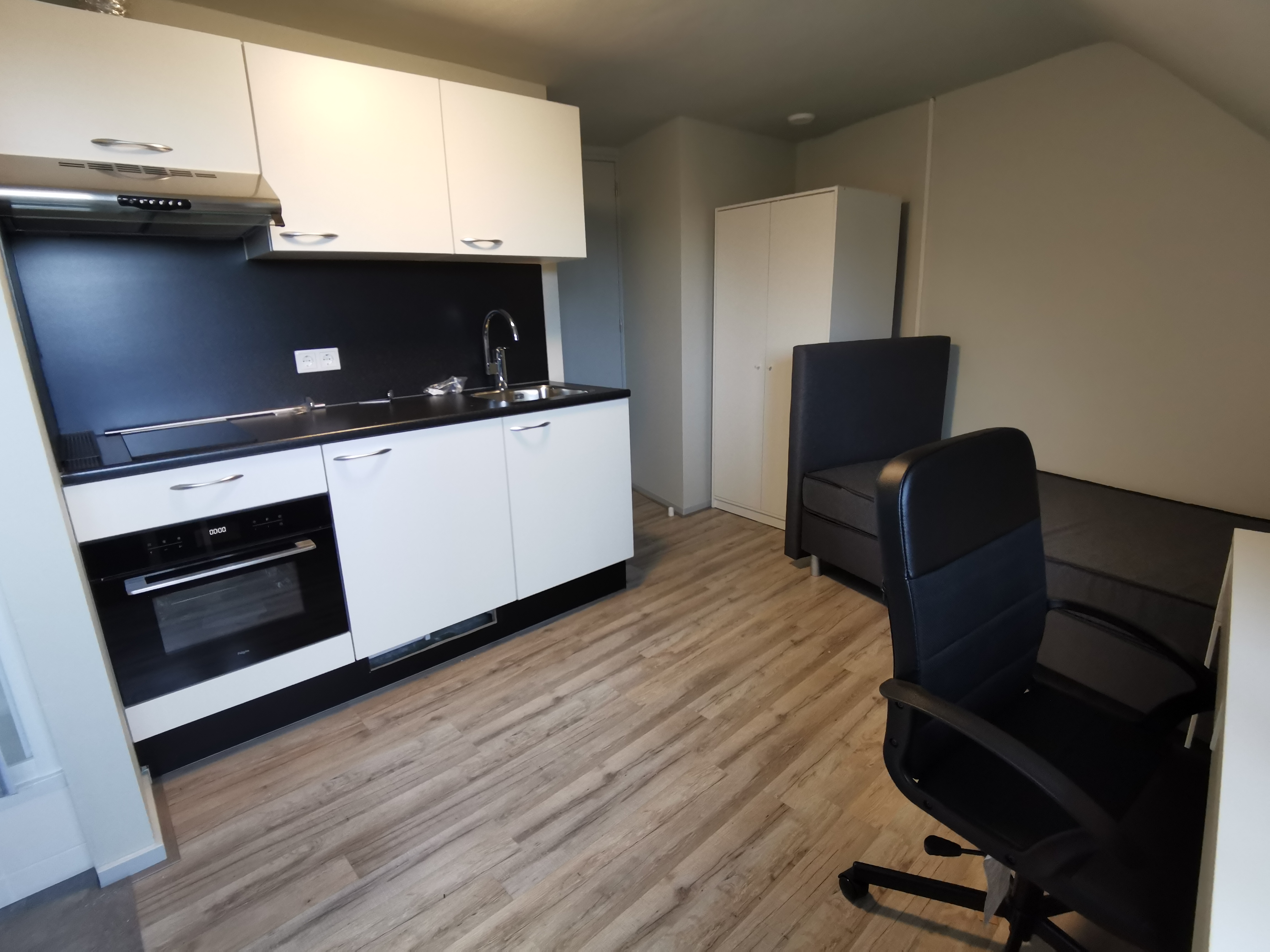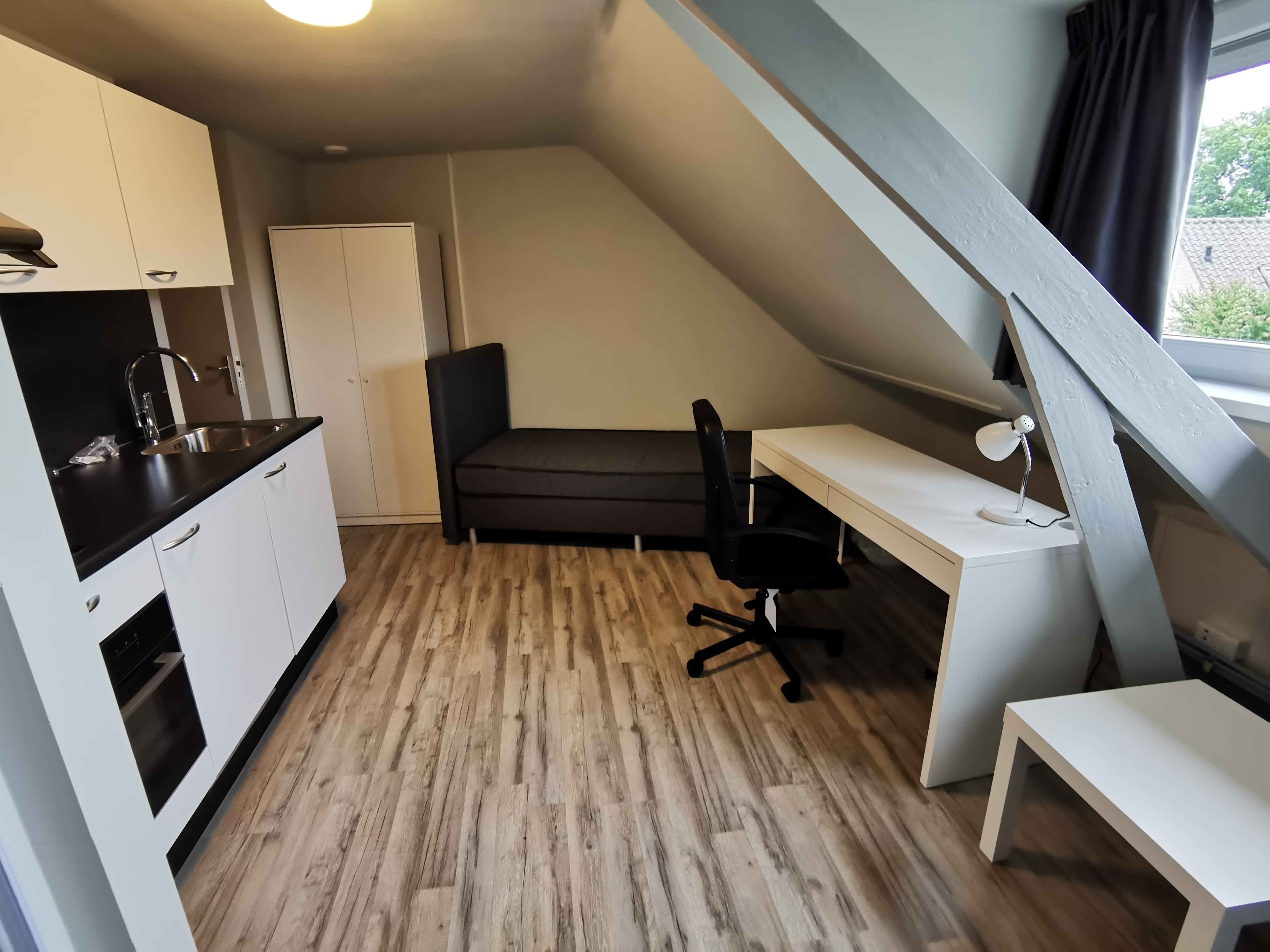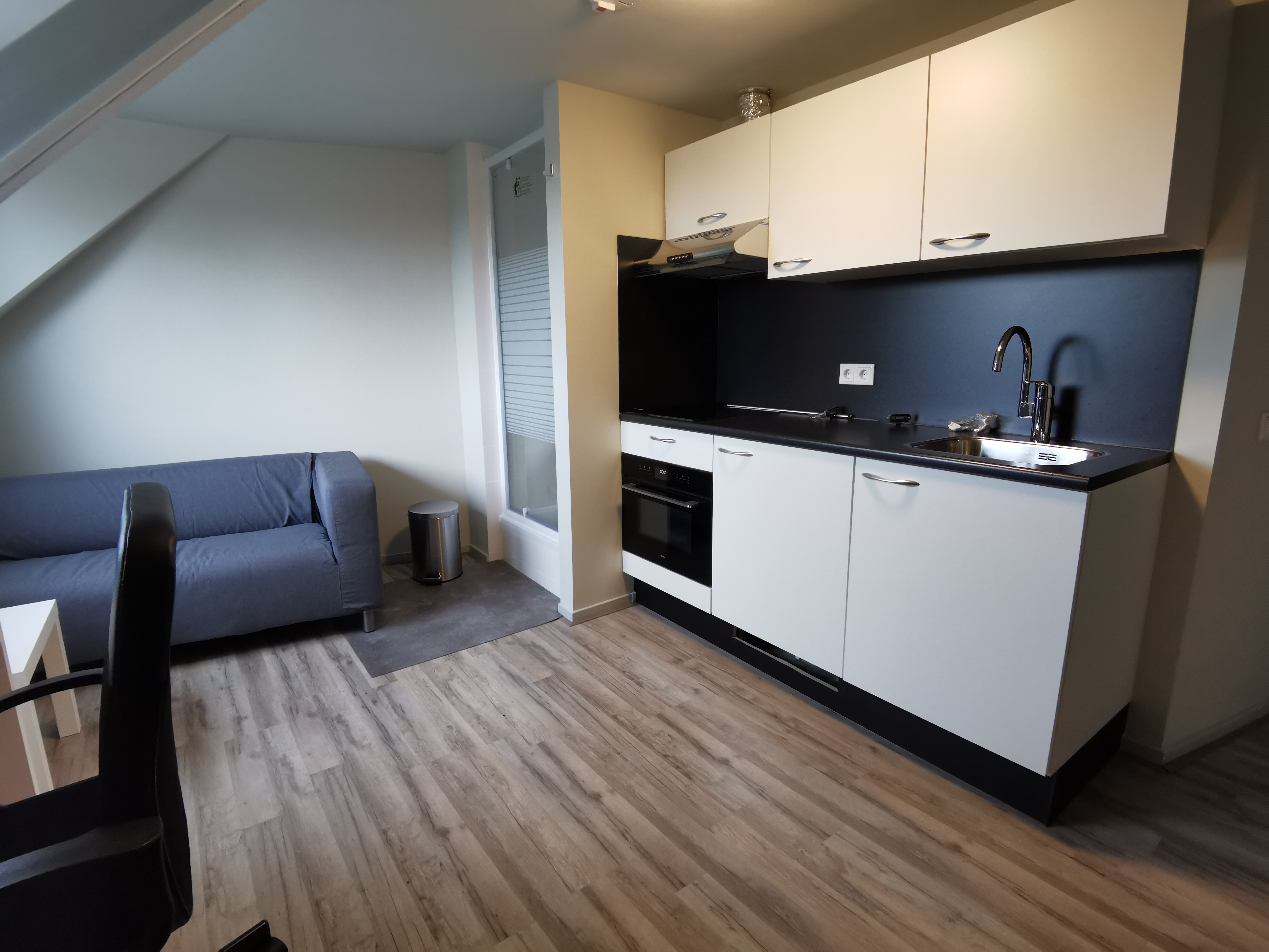 Available from: May 1st, 2026. The studio is located at the Laagstraat 275, a 5-minute bike ride from the city center and 15 minutes from TU/e + Fontys., The furnished studio at Laagstraat 275 in Eindhoven is located in a complex consisting of three floors, with a total of seven studios., The studio is located on the top floor at the front of the complex and has its own shower cabin and kitchenette. The kitchen is equipped with a 2-burner hob, fridge-freezer, and extractor hood. The two toilets and the washing machine are shared with the other residents., The studio is furnished with a sofa, bed, wardrobe, desk chair, and desk.